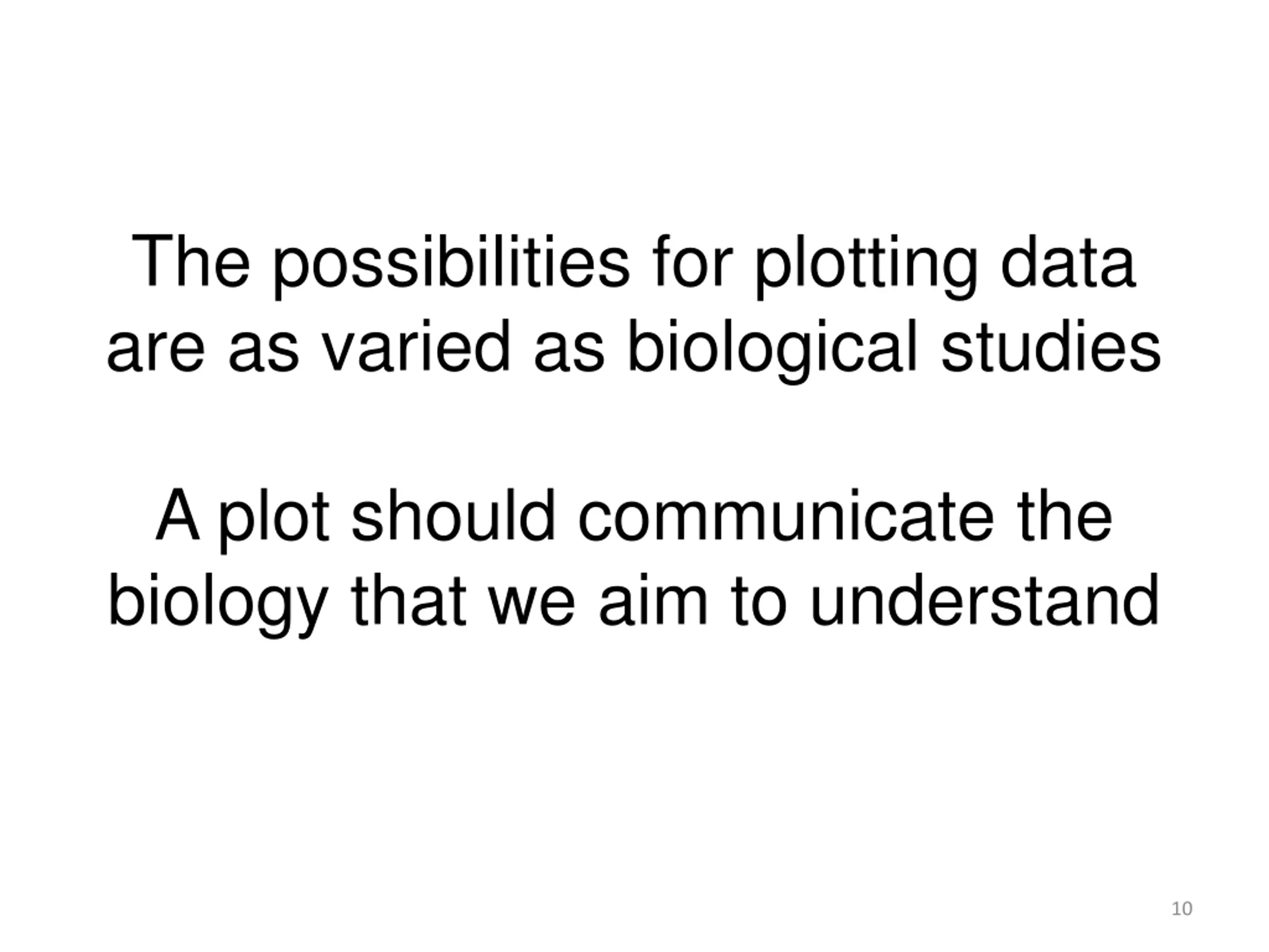 The possibilities for plotting data are as varied as biological studies A plot should communicate the biology that we aim to understand 10