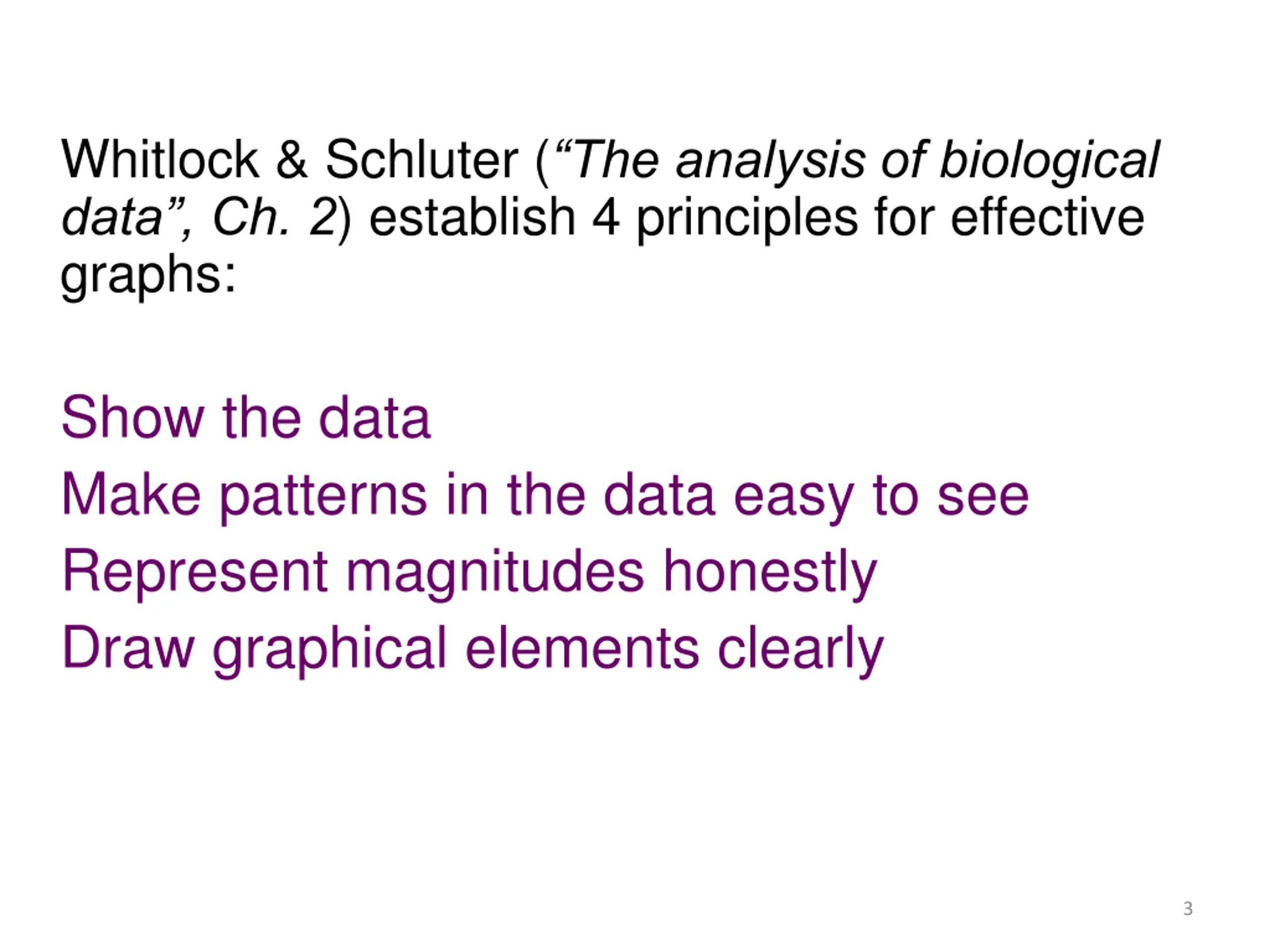 Whitlock & Schluter (The analysis of biological data , Ch. 2) establish 4 principles for effective graphs: Show the data Make patterns in the data easy to see Represent magnitudes honestly Draw graphical elements clearly 3