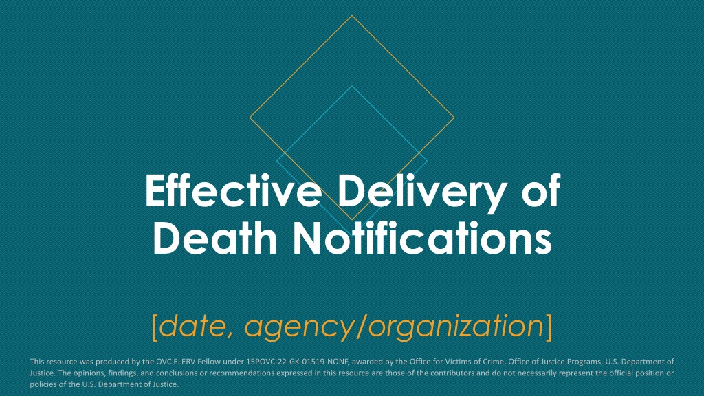 Effective Delivery of Death Notifications [date, agency/organization] This resource was produced by the OVC ELERV Fellow under 15POVC-22-GK-01519-NONF, awarded by the Office for Victims of Crime, Office of Justice Programs, U.S. Department of Justice. The opinions, findings, and conclusions or recommendations expressed in this resource are those of the contributors and do not necessarily represent the official position or policies of the U.S. Department of Justice.