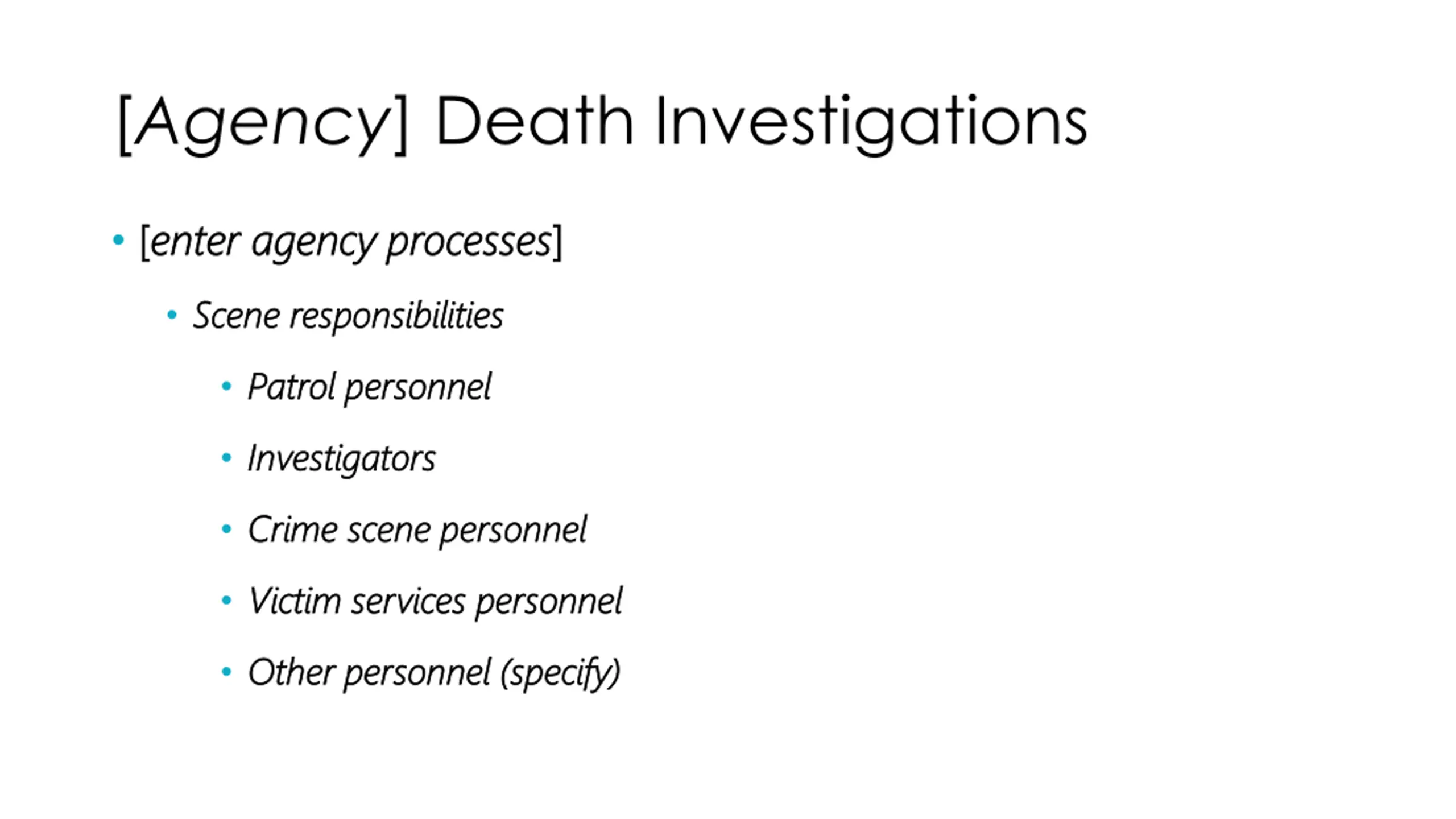 [Agency] Death Investigations [ [enter agency processes enter agency processes] ] Scene responsibilities Scene responsibilities Patrol personnel Patrol personnel Investigators Investigators Crime scene personnel Crime scene personnel Victim services personnel Victim services personnel Other personnel (specify) Other personnel (specify)