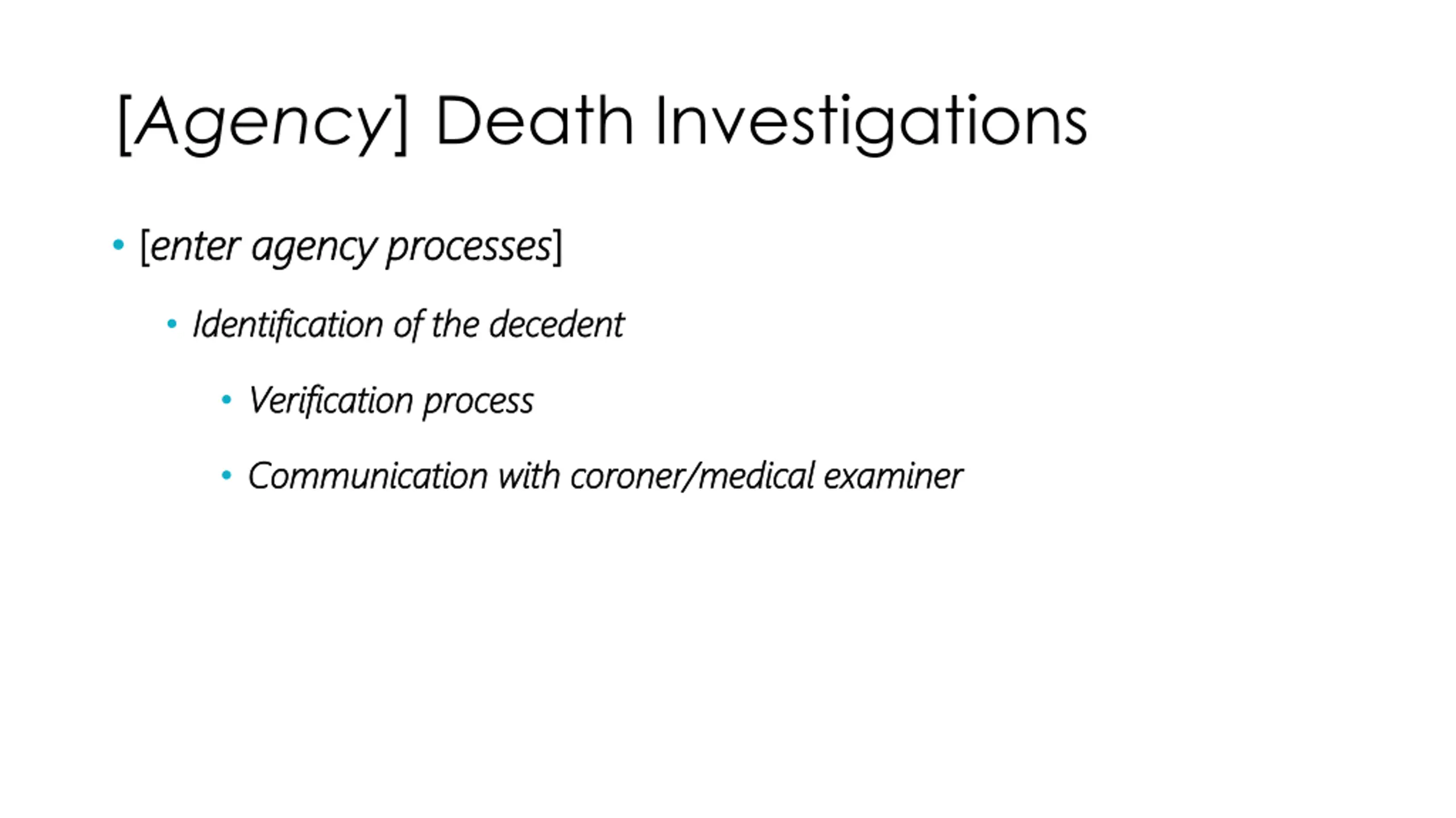 [Agency] Death Investigations [ [enter agency processes enter agency processes] ] Identification of the decedent Identification of the decedent Verification process Verification process Communication with coroner/medical examiner Communication with coroner/medical examiner