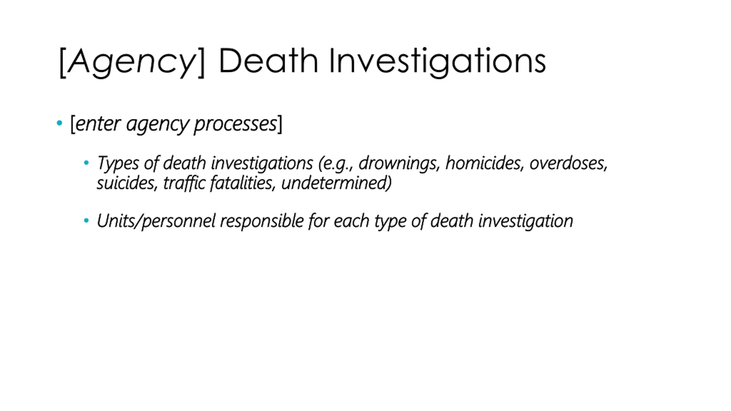[Agency] Death Investigations [ [enter agency processes enter agency processes] ] Types of death investigations (e.g., drownings, homicides, overdoses, Types of death investigations (e.g., drownings, homicides, overdoses, suicides, traffic fatalities, undetermined) suicides, traffic fatalities, undetermined) Units/personnel responsible for each type of death investigation Units/personnel responsible for each type of death investigation
