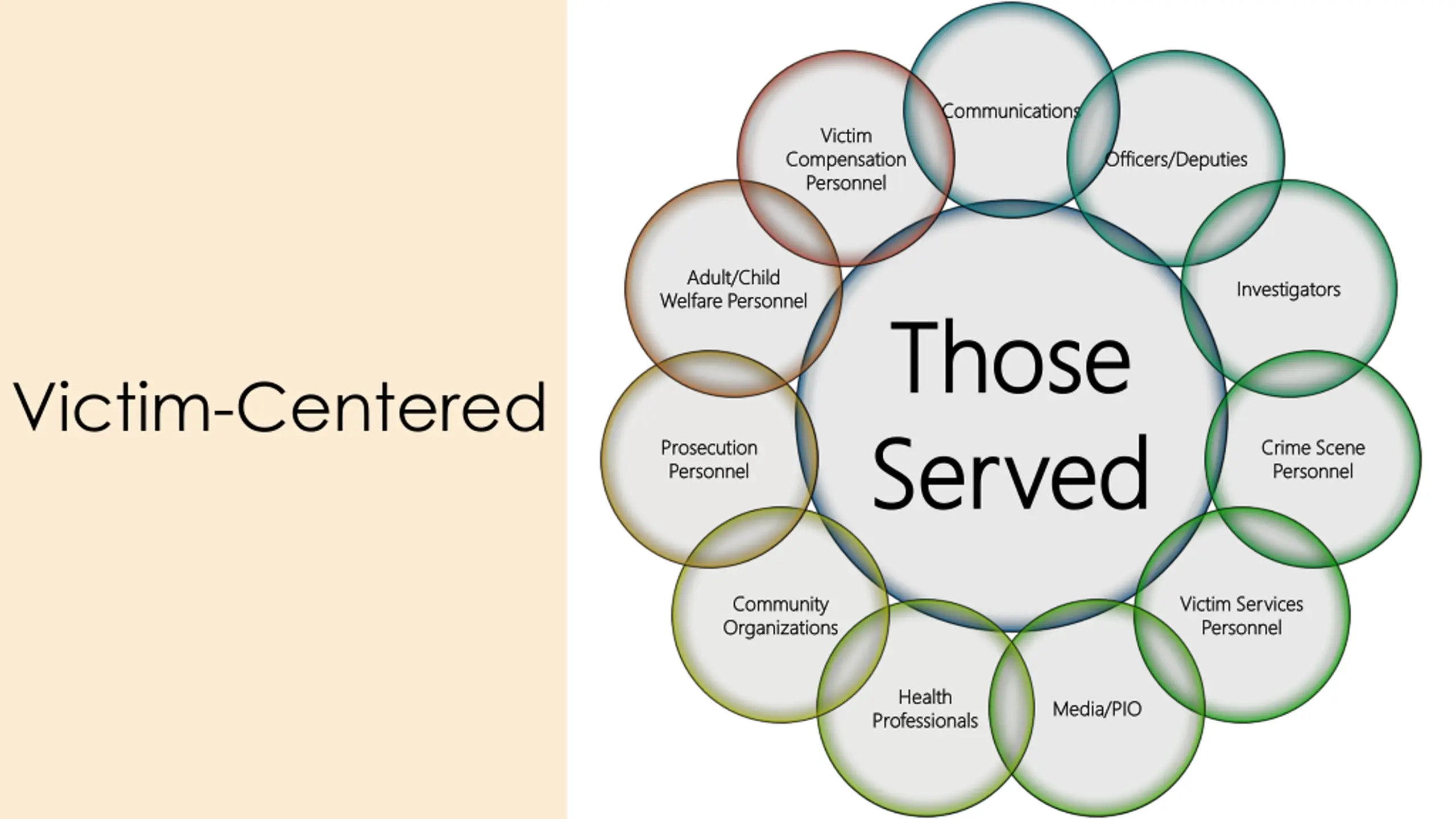 Communications Communications Victim Victim Compensation Compensation Personnel Personnel Officers/Deputies Officers/Deputies Adult/Child Adult/Child Welfare Personnel Welfare Personnel Investigators Investigators Those Those Served Served Victim-Centered Prosecution Prosecution Personnel Personnel Crime Scene Crime Scene Personnel Personnel Community Community Organizations Organizations Victim Services Victim Services Personnel Personnel Health Health Professionals Professionals Media/PIO Media/PIO