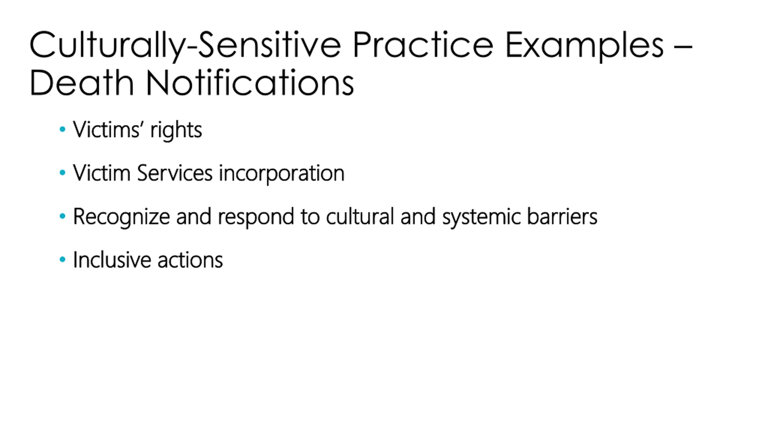 Culturally-Sensitive Practice Examples Death Notifications Victims rights Victims rights Victim Services incorporation Victim Services incorporation Recognize and respond to cultural and systemic barriers Recognize and respond to cultural and systemic barriers Inclusive actions Inclusive actions