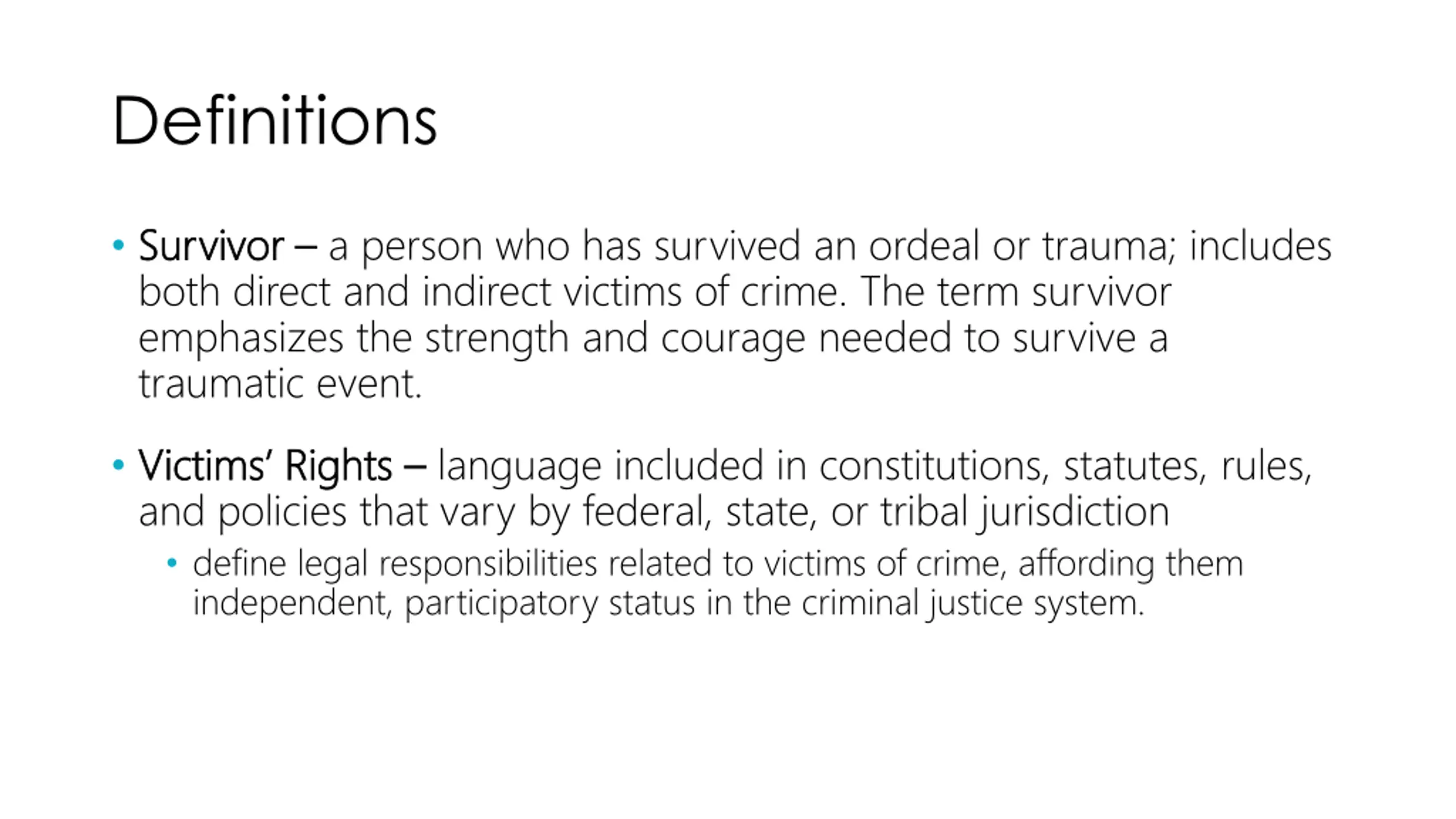 Definitions Survivor Survivor a person who has survived an ordeal or trauma; includes both direct and indirect victims of crime. The term survivor emphasizes the strength and courage needed to survive a traumatic event. Victims Rights Victims Rights language included in constitutions, statutes, rules, and policies that vary by federal, state, or tribal jurisdiction define legal responsibilities related to victims of crime, affording them independent, participatory status in the criminal justice system.