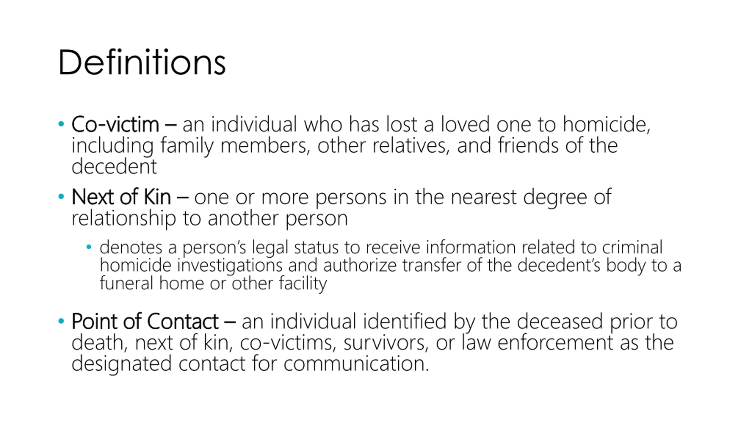 Definitions Co Co- -victim victim an individual who has lost a loved one to homicide, including family members, other relatives, and friends of the decedent Next of Kin Next of Kin one or more persons in the nearest degree of relationship to another person denotes a person s legal status to receive information related to criminal homicide investigations and authorize transfer of the decedent s body to a funeral home or other facility Point of Contact Point of Contact an individual identified by the deceased prior to death, next of kin, co-victims, survivors, or law enforcement as the designated contact for communication.