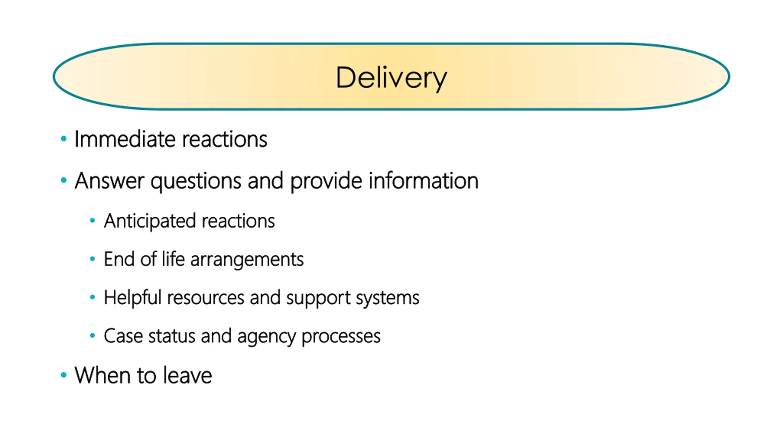 Delivery Immediate reactions Immediate reactions Answer questions and provide information Answer questions and provide information Anticipated reactions Anticipated reactions End of life arrangements End of life arrangements Helpful resources and support systems Helpful resources and support systems Case status and agency processes Case status and agency processes When to leave When to leave