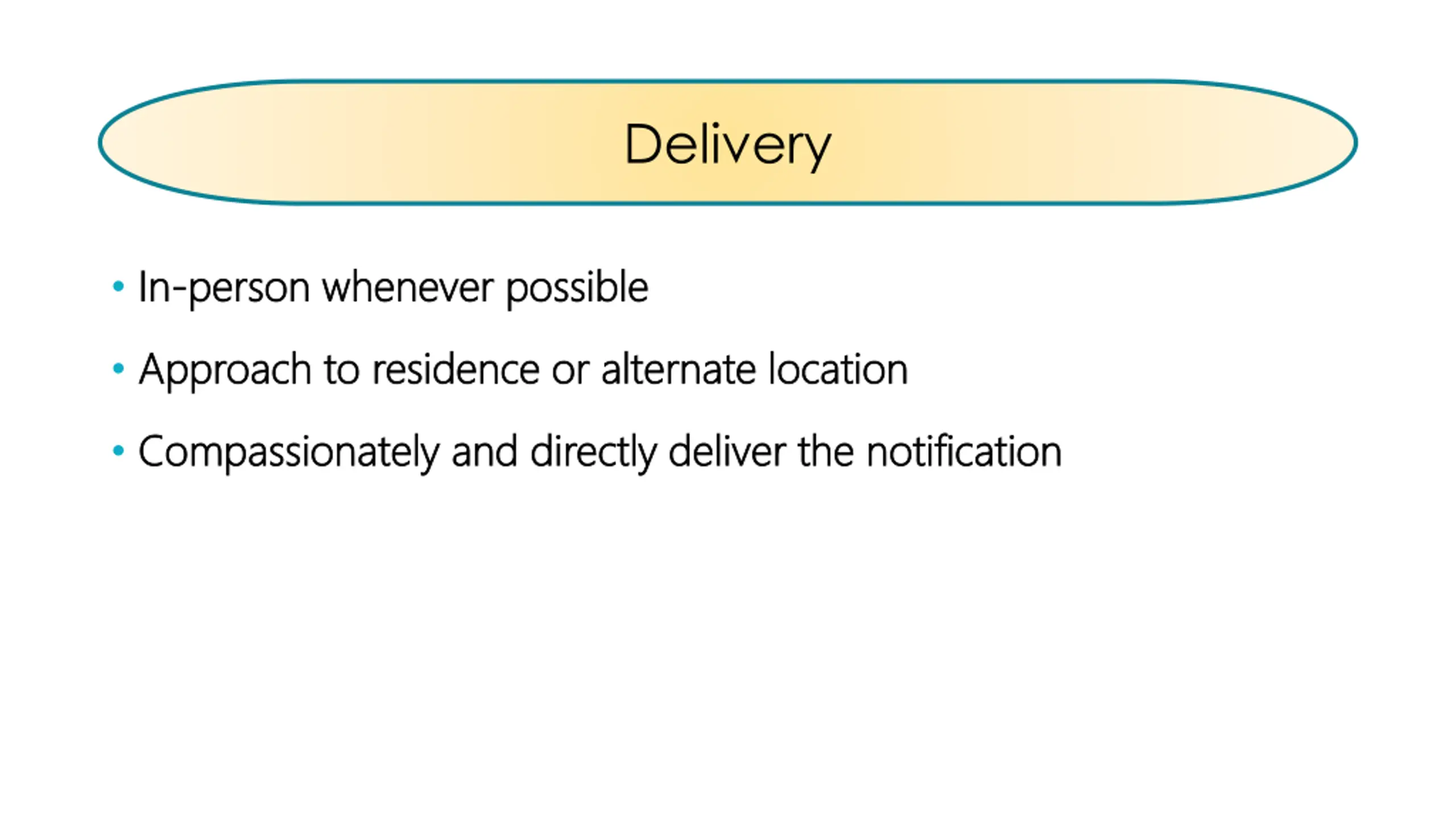 Delivery In In- -person whenever possible person whenever possible Approach to residence or alternate location Approach to residence or alternate location Compassionately and directly deliver the notification Compassionately and directly deliver the notification
