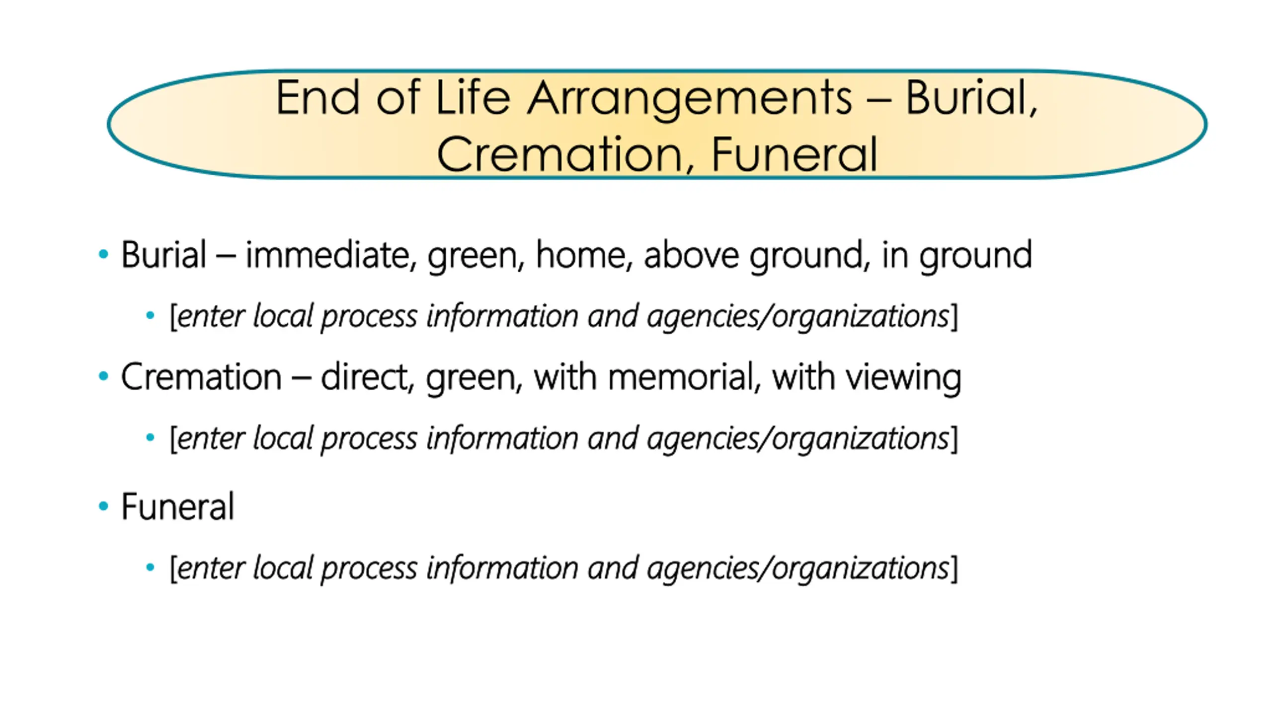 End of Life Arrangements Burial, Cremation, Funeral Burial Burial immediate, green, home, above ground, in ground immediate, green, home, above ground, in ground [ [enter local process information and agencies/organizations enter local process information and agencies/organizations] ] Cremation Cremation direct, green, with memorial, with viewing direct, green, with memorial, with viewing [ [enter local process information and agencies/organizations enter local process information and agencies/organizations] ] Funeral Funeral [ [enter local process information and agencies/organizations enter local process information and agencies/organizations] ]