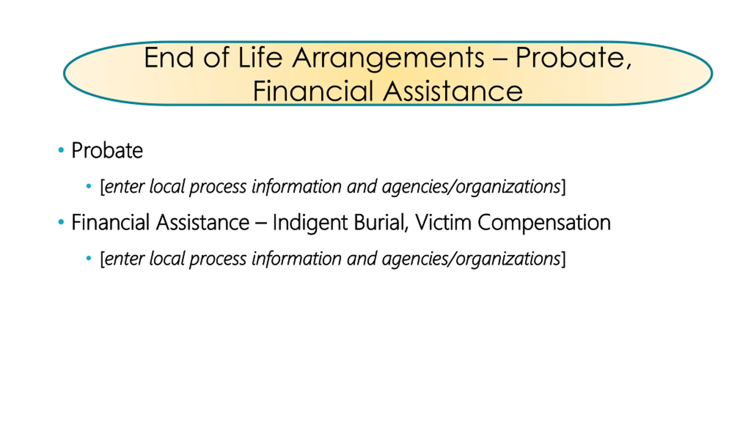 End of Life Arrangements Probate, Financial Assistance Probate Probate [ [enter local process information and agencies/organizations enter local process information and agencies/organizations] ] Financial Assistance Financial Assistance Indigent Burial, Victim Compensation Indigent Burial, Victim Compensation [ [enter local process information and agencies/organizations enter local process information and agencies/organizations] ]
