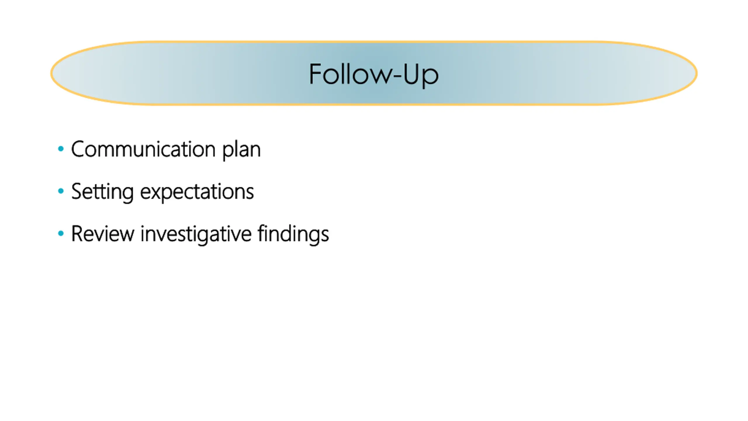 Follow-Up Communication plan Communication plan Setting expectations Setting expectations Review investigative findings Review investigative findings