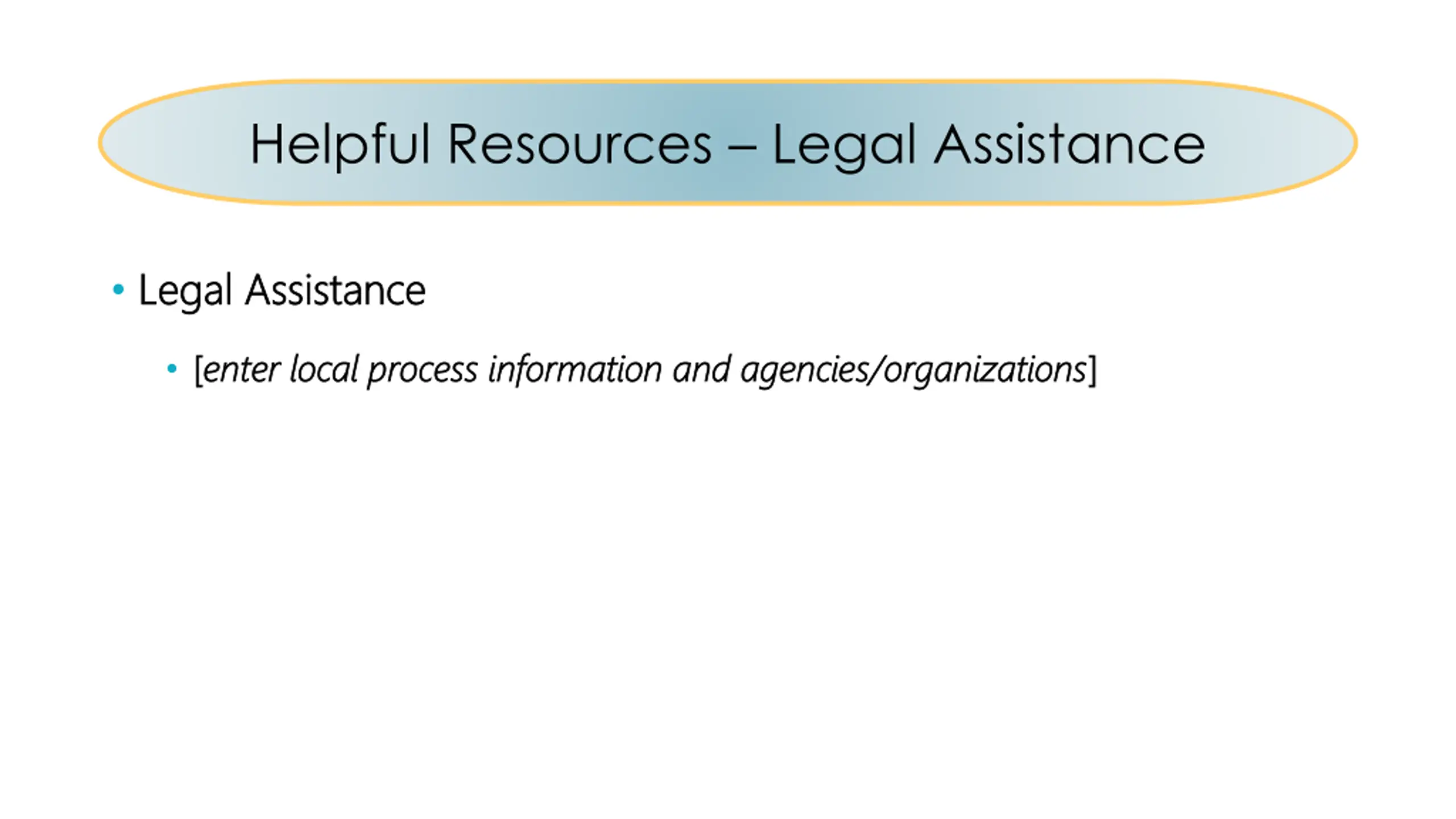 Helpful Resources Legal Assistance Legal Assistance Legal Assistance [ [enter local process information and agencies/organizations enter local process information and agencies/organizations] ]
