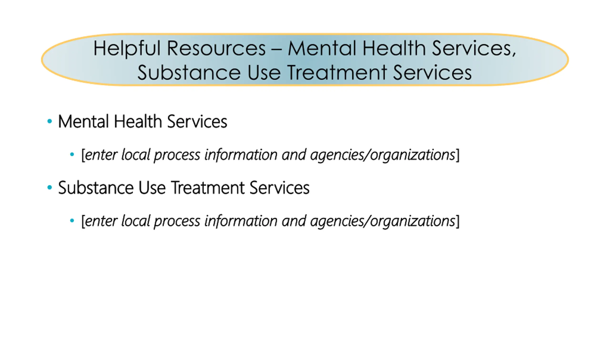 Helpful Resources Mental Health Services, Substance Use Treatment Services Mental Health Services Mental Health Services [ [enter local process information and agencies/organizations enter local process information and agencies/organizations] ] Substance Use Treatment Services Substance Use Treatment Services [ [enter local process information and agencies/organizations enter local process information and agencies/organizations] ]