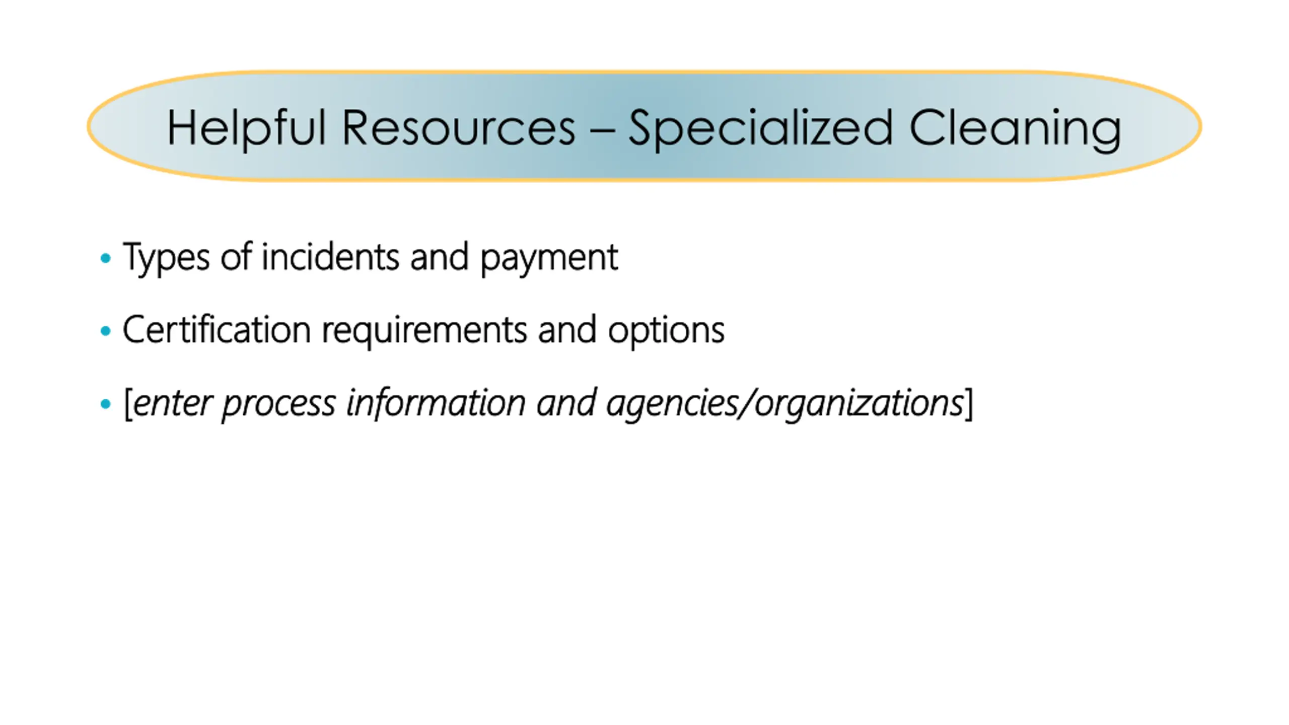 Helpful Resources Specialized Cleaning Types of incidents and payment Types of incidents and payment Certification requirements and options Certification requirements and options [ [enter process information and agencies enter process information and agencies/organizations /organizations] ]