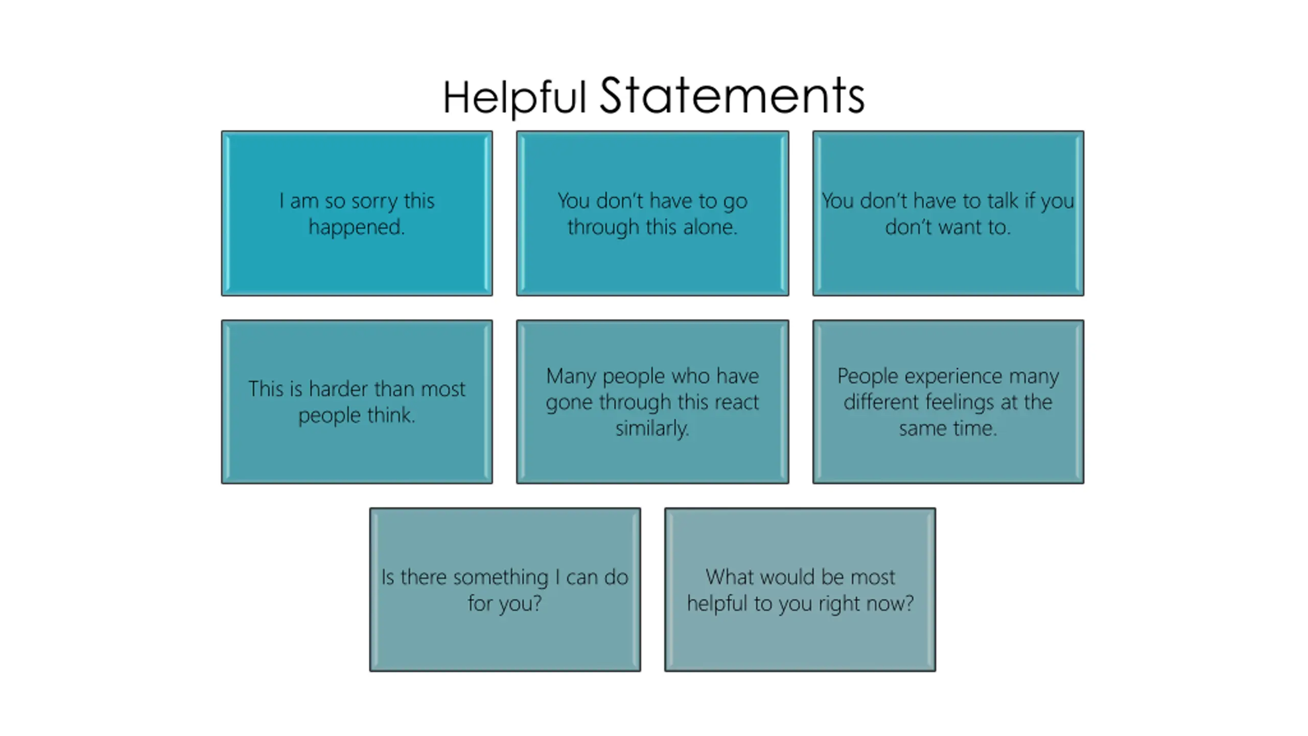 Helpful Statements I am so sorry this happened. You don t have to go through this alone. You don t have to talk if you don t want to. Many people who have gone through this react similarly. People experience many different feelings at the same time. This is harder than most people think. Is there something I can do for you? What would be most helpful to you right now?
