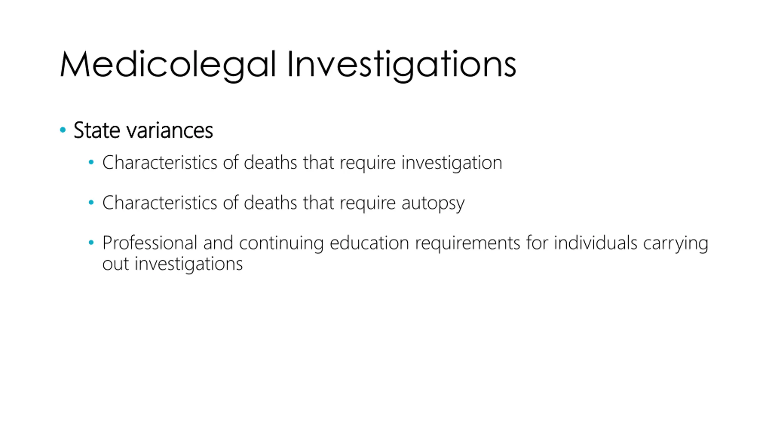 Medicolegal Investigations State variances State variances Characteristics of deaths that require investigation Characteristics of deaths that require autopsy Professional and continuing education requirements for individuals carrying out investigations