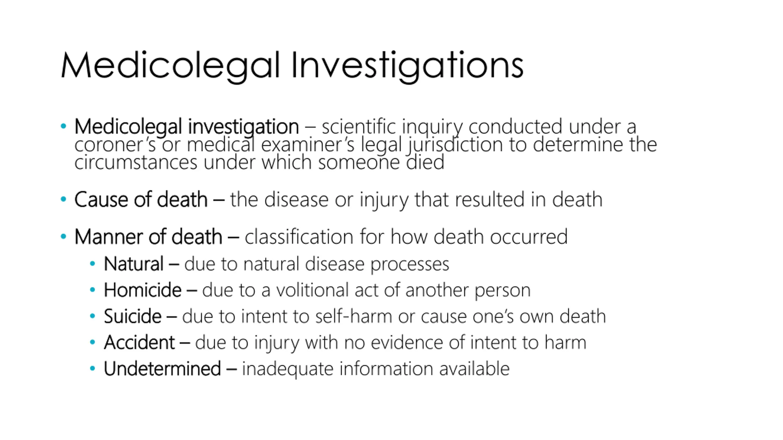 Medicolegal Investigations Medicolegal investigation Medicolegal investigation scientific inquiry conducted under a coroner s or medical examiner s legal jurisdiction to determine the circumstances under which someone died Cause of death Cause of death the disease or injury that resulted in death Manner of death Manner of death classification for how death occurred Natural Natural due to natural disease processes Homicide Homicide due to a volitional act of another person Suicide Suicide due to intent to self-harm or cause one s own death Accident Accident due to injury with no evidence of intent to harm Undetermined Undetermined inadequate information available