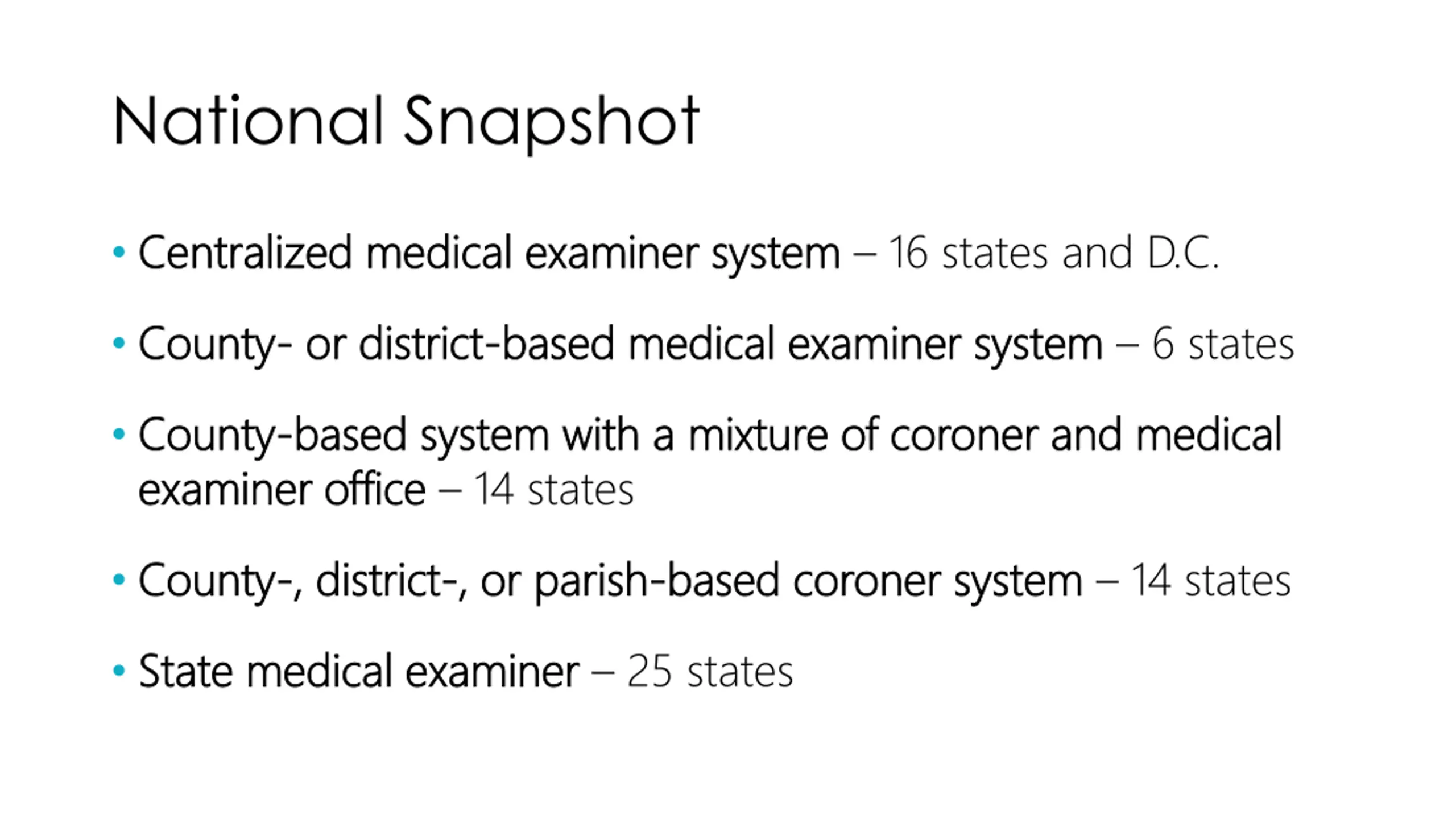 National Snapshot Centralized medical examiner system Centralized medical examiner system 16 states and D.C. County County- - or district or district- -based medical examiner system based medical examiner system 6 states County County- -based system with a mixture of coroner and medical based system with a mixture of coroner and medical examiner office examiner office 14 states County County- -, district , district- -, or parish , or parish- -based coroner system based coroner system 14 states State medical examiner State medical examiner 25 states