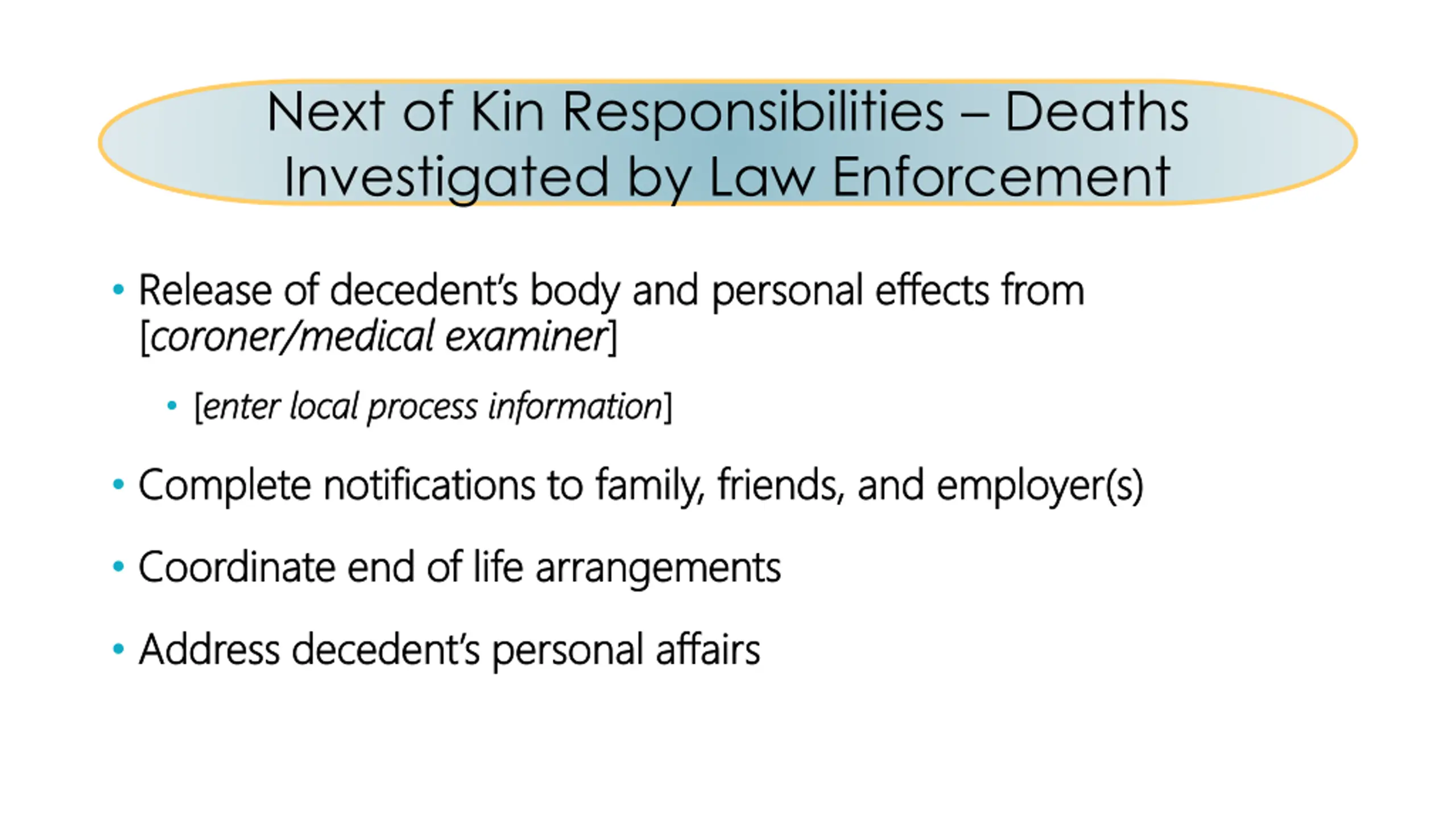 Next of Kin Responsibilities Deaths Investigated by Law Enforcement Release of decedent s body and personal effects from Release of decedent s body and personal effects from [ [coroner/medical examiner coroner/medical examiner] ] [ [enter local process information enter local process information] ] Complete notifications to family, friends, and employer(s) Complete notifications to family, friends, and employer(s) Coordinate end of life arrangements Coordinate end of life arrangements Address decedent s personal affairs Address decedent s personal affairs