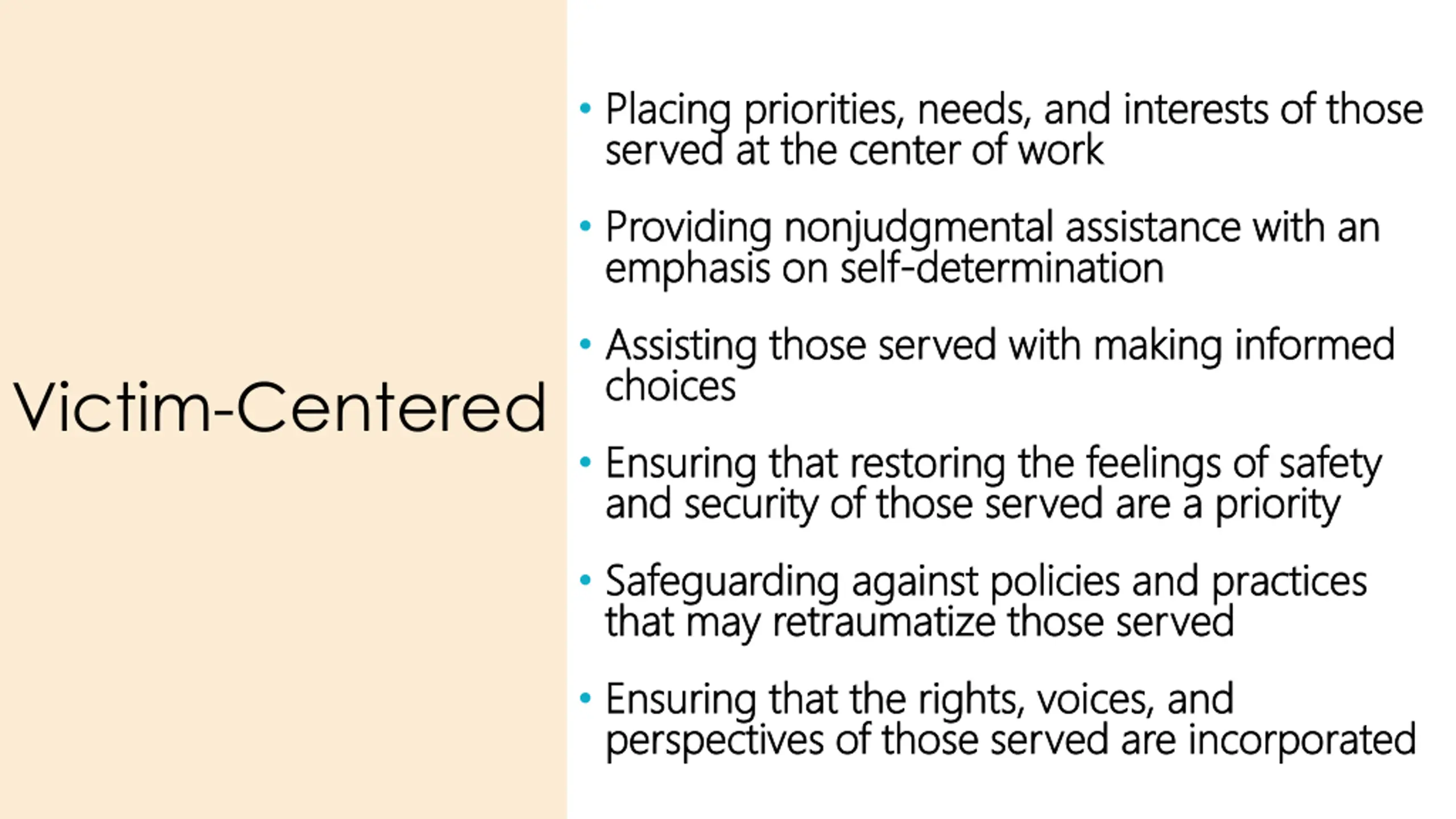 Placing priorities, needs, and interests of those Placing priorities, needs, and interests of those served at the center of work served at the center of work Providing nonjudgmental assistance with an Providing nonjudgmental assistance with an emphasis on self emphasis on self- -determination determination Assisting those served with making informed Assisting those served with making informed choices choices Ensuring that restoring the feelings of safety Ensuring that restoring the feelings of safety and security of those served are a priority and security of those served are a priority Safeguarding against policies and practices Safeguarding against policies and practices that may retraumatize those served that may retraumatize those served Ensuring that the rights, voices, and Ensuring that the rights, voices, and perspectives of those served are incorporated perspectives of those served are incorporated Victim-Centered