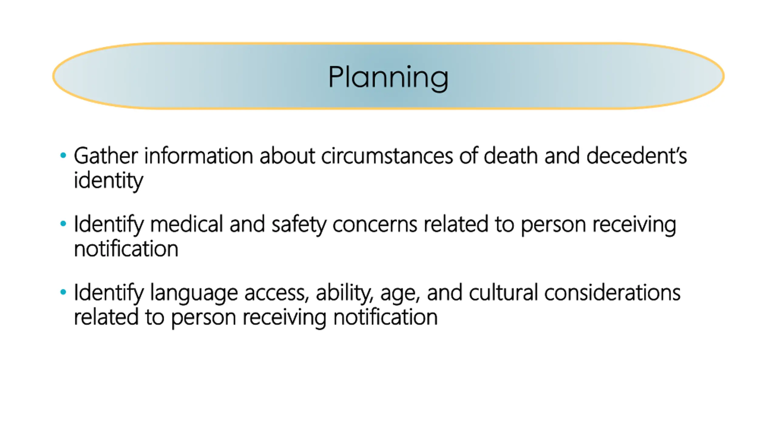 Planning Gather information about circumstances of death and decedent s Gather information about circumstances of death and decedent s identity identity Identify medical and safety concerns related to person receiving Identify medical and safety concerns related to person receiving notification notification Identify language access, ability, age, and cultural considerations Identify language access, ability, age, and cultural considerations related to person receiving notification related to person receiving notification
