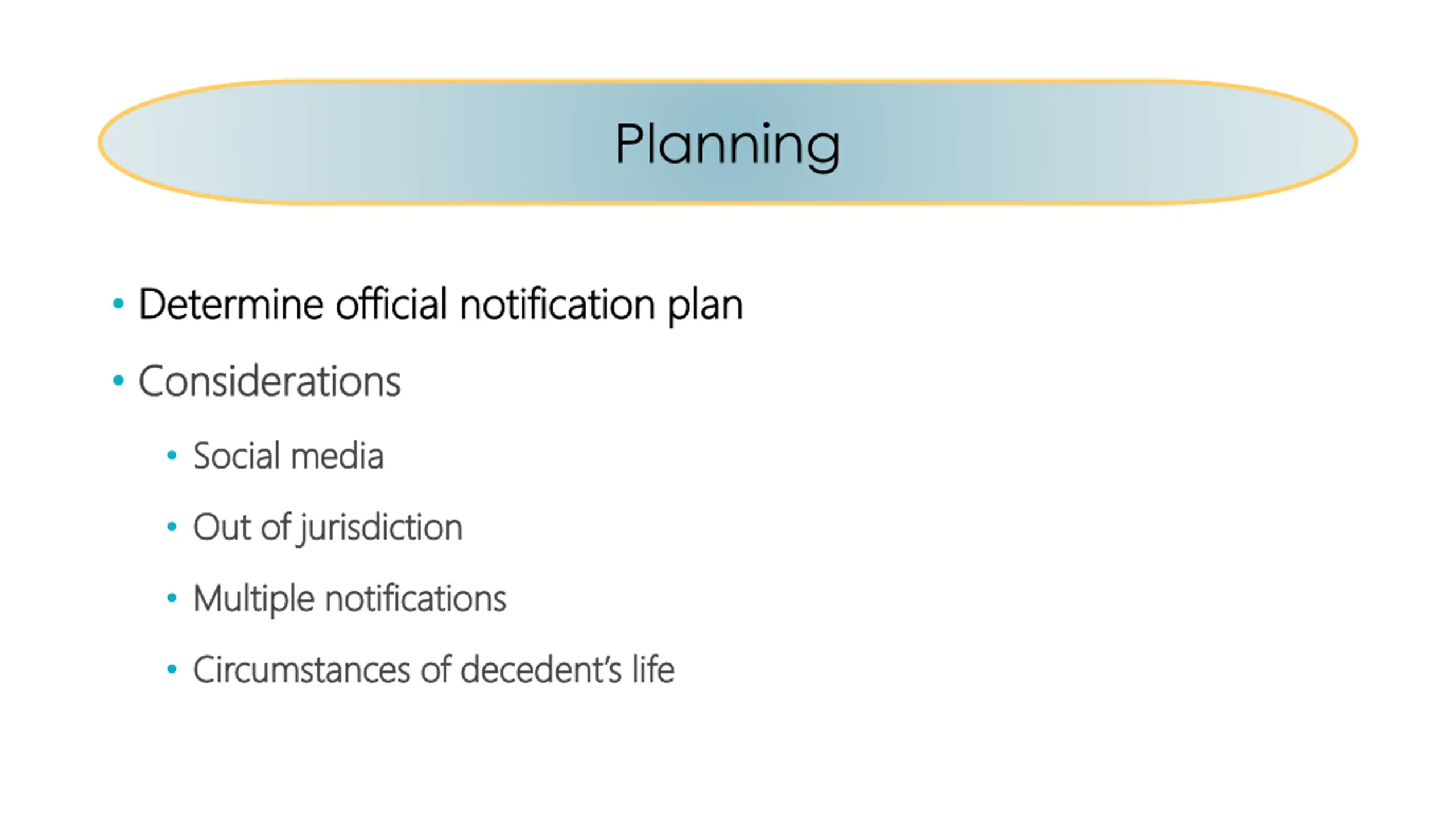 Planning Determine official notification plan Determine official notification plan Considerations Considerations Social media Social media Out of jurisdiction Out of jurisdiction Multiple notifications Multiple notifications Circumstances of decedent s life Circumstances of decedent s life