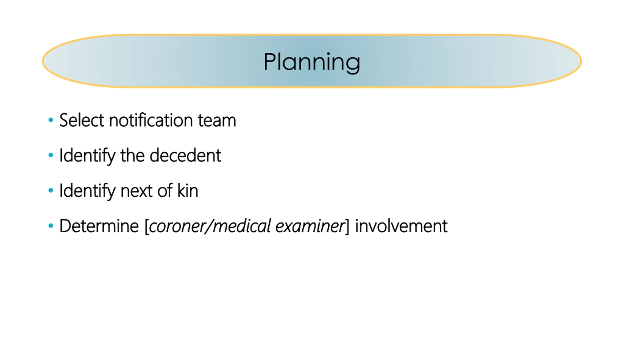 Planning Select notification team Select notification team Identify the decedent Identify the decedent Identify next of kin Identify next of kin Determine [ Determine [coroner/medical examiner coroner/medical examiner] involvement ] involvement