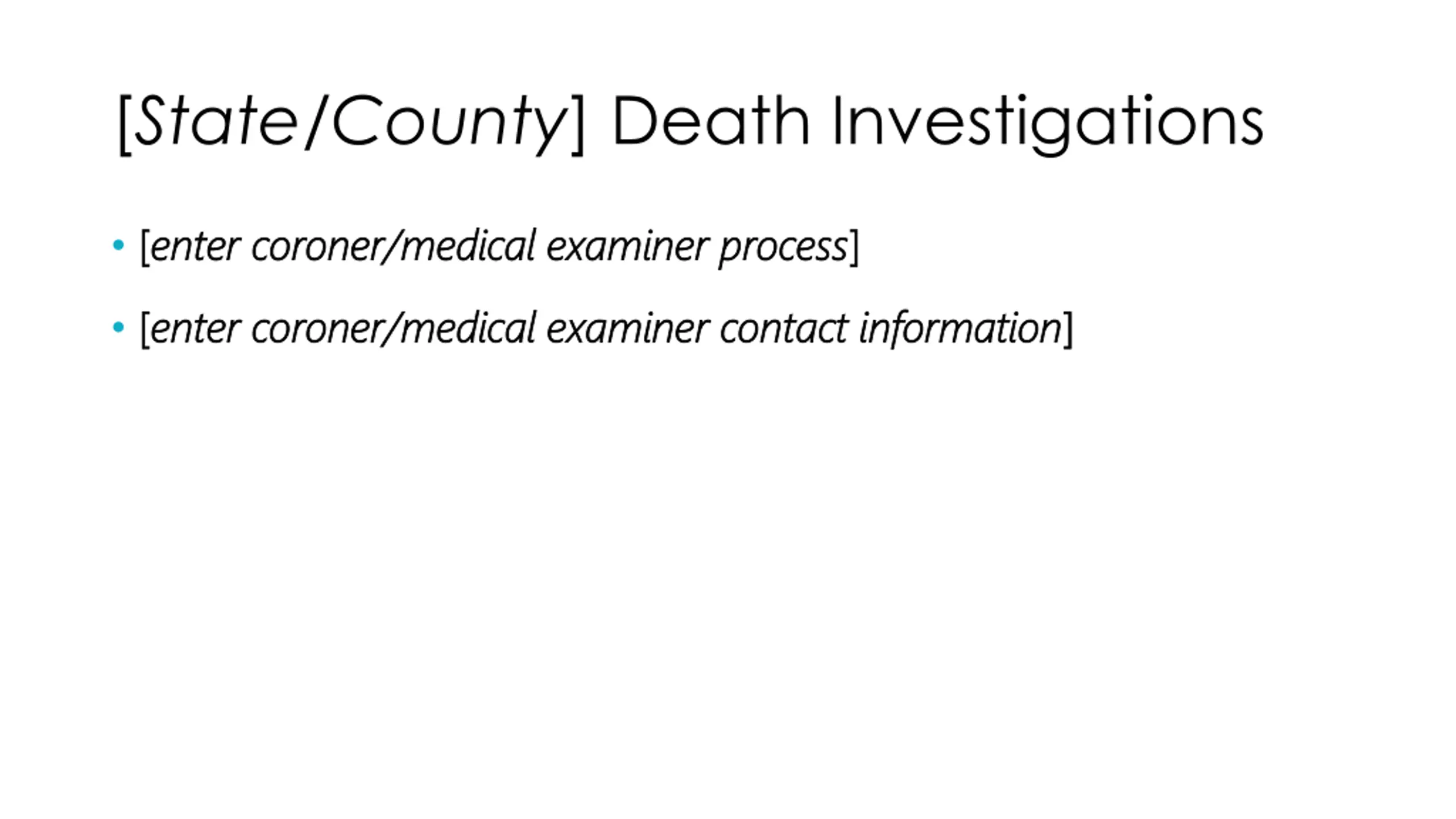[State/County] Death Investigations [ [enter coroner/medical examiner process enter coroner/medical examiner process] ] [ [enter coroner/medical examiner contact information enter coroner/medical examiner contact information] ]