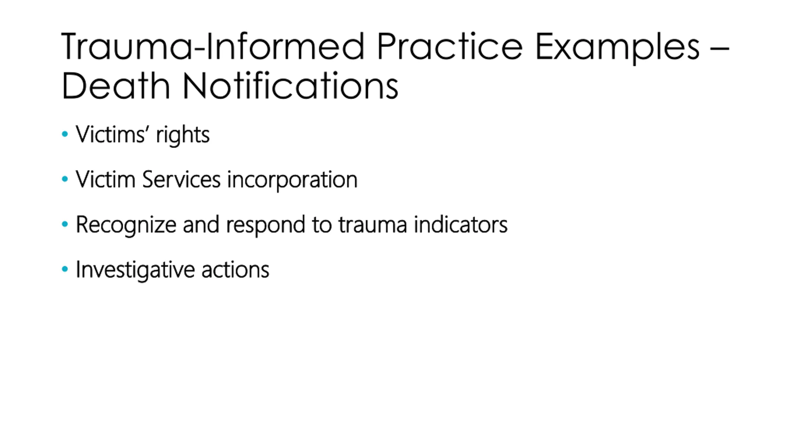Trauma-Informed Practice Examples Death Notifications Victims rights Victims rights Victim Services incorporation Victim Services incorporation Recognize and respond to trauma indicators Recognize and respond to trauma indicators Investigative actions Investigative actions