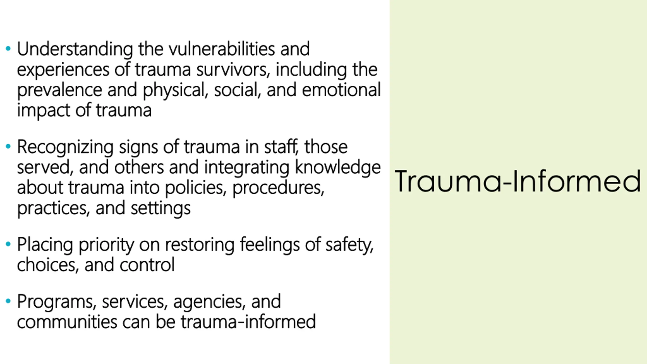 Understanding the vulnerabilities and Understanding the vulnerabilities and experiences of trauma survivors, including the experiences of trauma survivors, including the prevalence and physical, social, and emotional prevalence and physical, social, and emotional impact of trauma impact of trauma Recognizing signs of trauma in staff, those Recognizing signs of trauma in staff, those served, and others and integrating knowledge served, and others and integrating knowledge about trauma into policies, procedures, about trauma into policies, procedures, practices, and settings practices, and settings Trauma-Informed Placing priority on restoring feelings of safety, Placing priority on restoring feelings of safety, choices, and control choices, and control Programs, services, agencies, and Programs, services, agencies, and communities can be trauma communities can be trauma- -informed informed