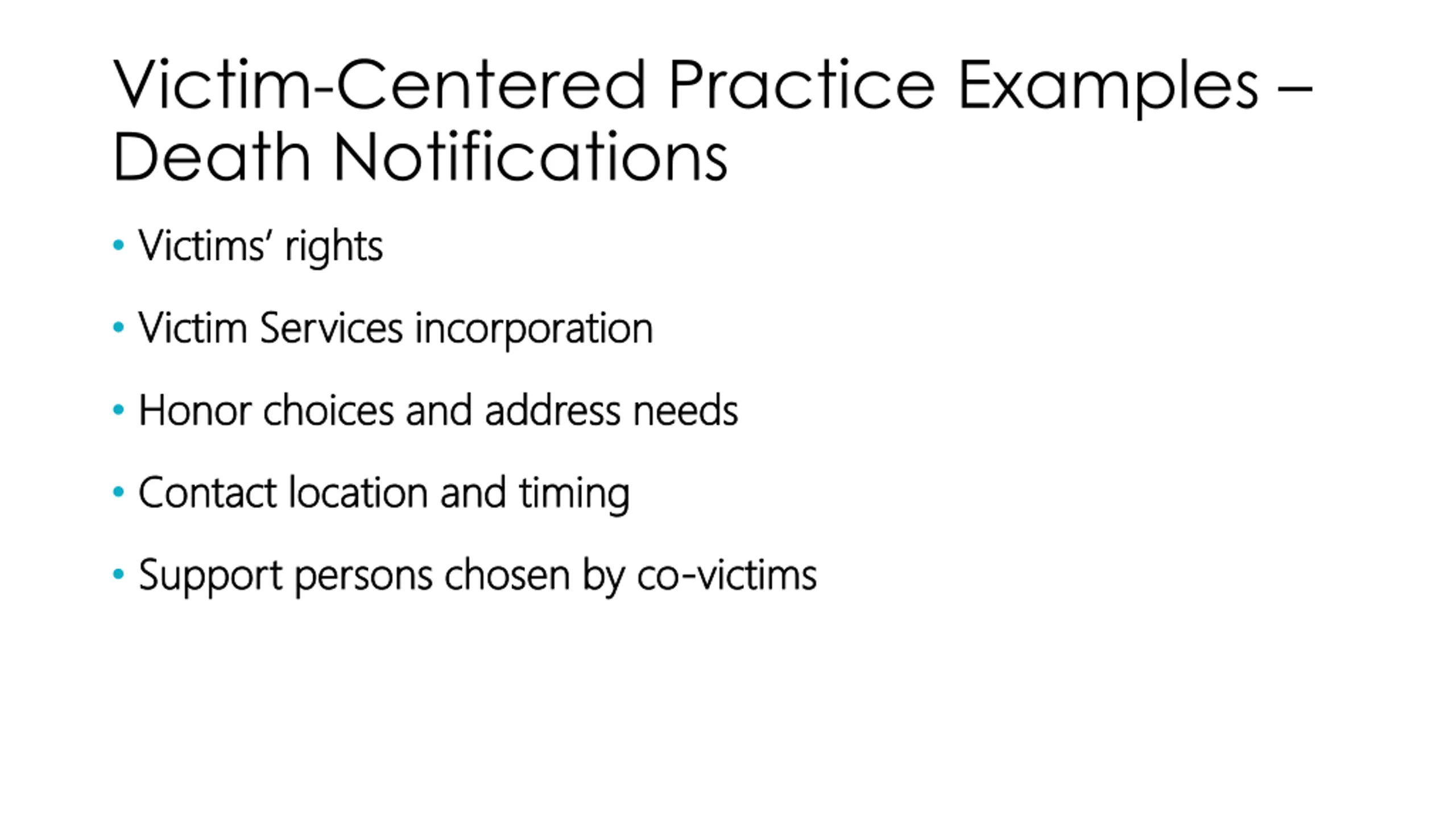 Victim-Centered Practice Examples Death Notifications Victims rights Victims rights Victim Services incorporation Victim Services incorporation Honor choices and address needs Honor choices and address needs Contact location and timing Contact location and timing Support persons chosen by co Support persons chosen by co- -victims victims