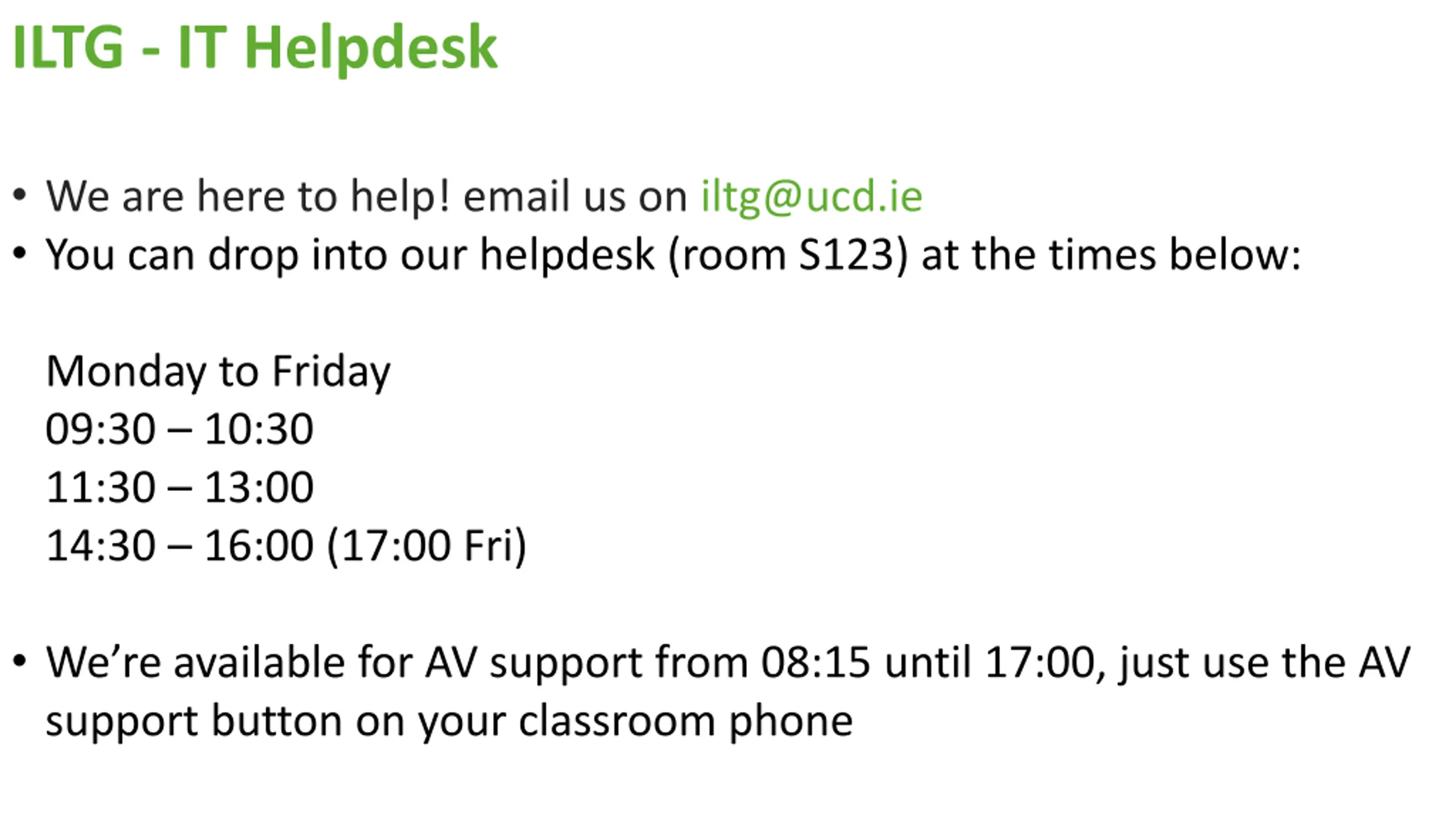ILTG - IT Helpdesk We are here to help! email us on iltg@ucd.ie You can drop into our helpdesk (room S123) at the times below: Monday to Friday 09:30 10:30 11:30 13:00 14:30 16:00 (17:00 Fri) We re available for AV support from 08:15 until 17:00, just use the AV support button on your classroom phone