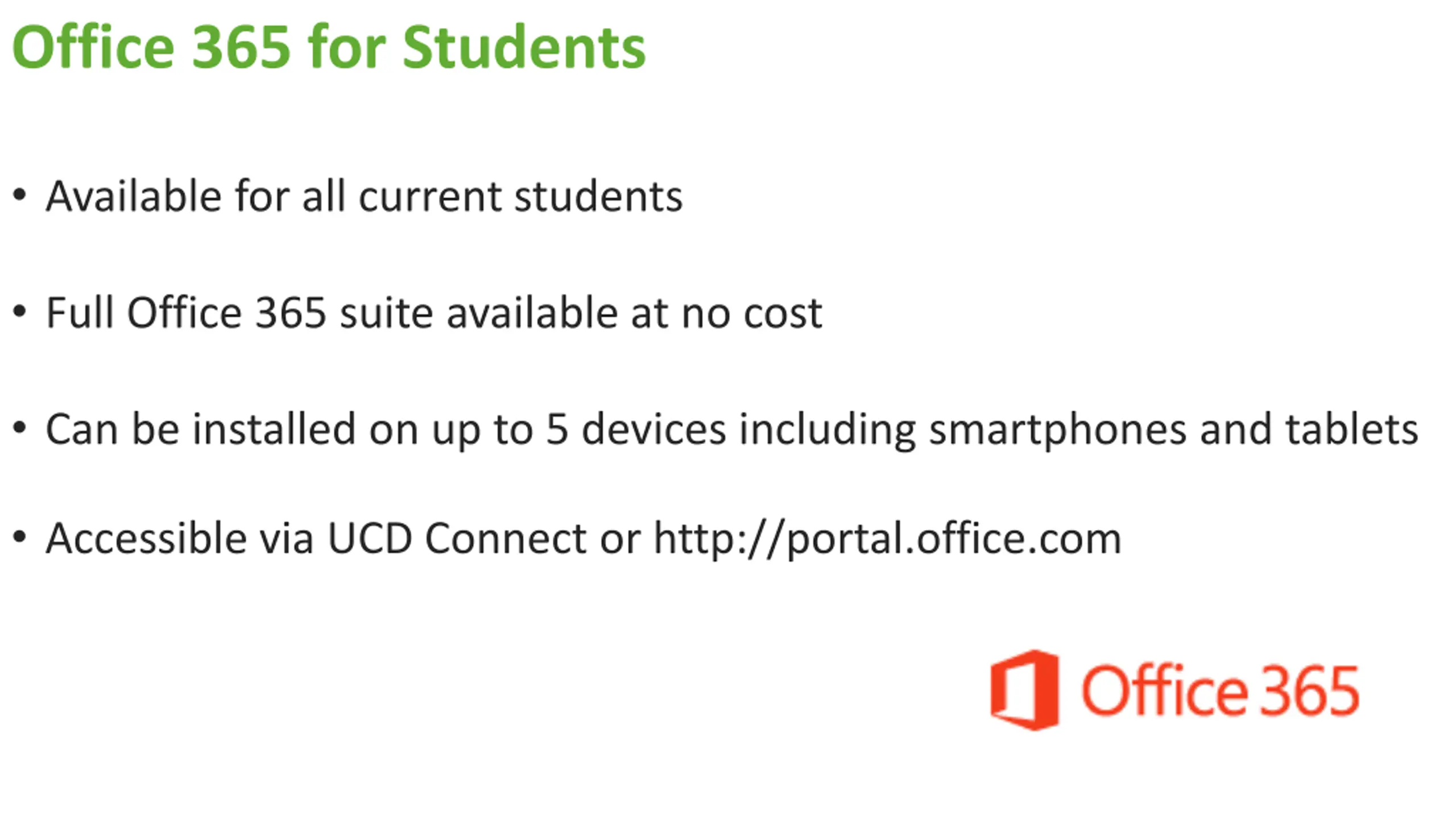 Office 365 for Students Available for all current students Full Office 365 suite available at no cost Can be installed on up to 5 devices including smartphones and tablets Accessible via UCD Connect or http://portal.office.com