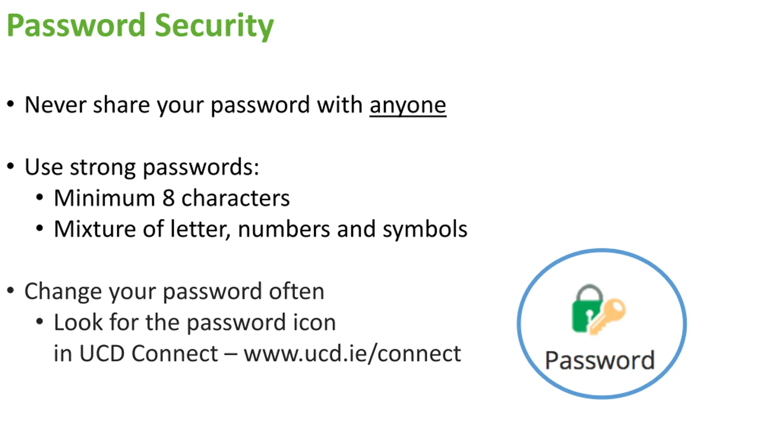 Password Security Never share your password with anyone Use strong passwords: Minimum 8 characters Mixture of letter, numbers and symbols Change your password often Look for the password icon in UCD Connect www.ucd.ie/connect
