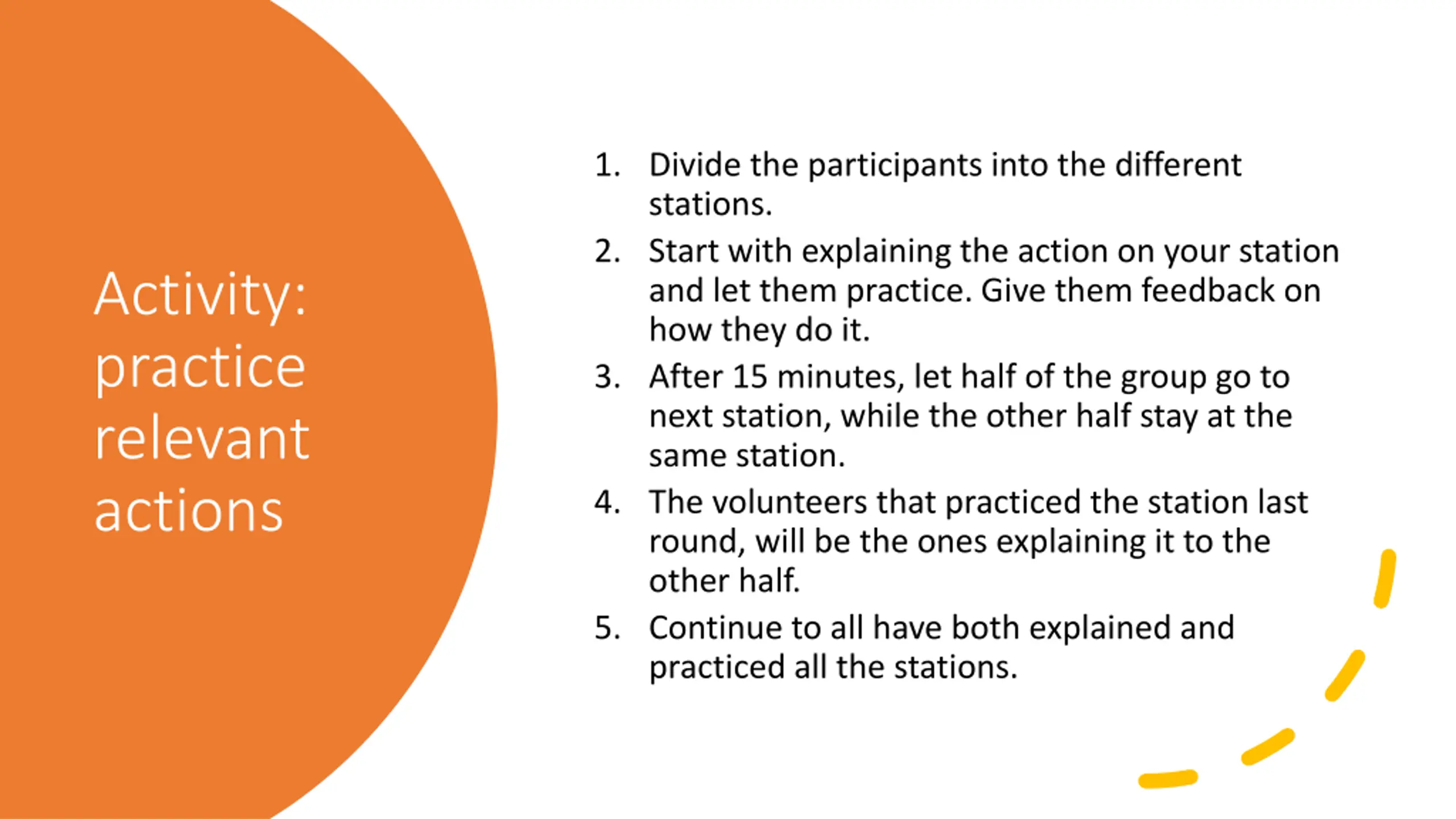 1. Divide the participants into the different stations. 2. Start with explaining the action on your station and let them practice. Give them feedback on how they do it. 3. After 15 minutes, let half of the group go to next station, while the other half stay at the same station. 4. The volunteers that practiced the station last round, will be the ones explaining it to the other half. 5. Continue to all have both explained and practiced all the stations. Activity: practice relevant actions