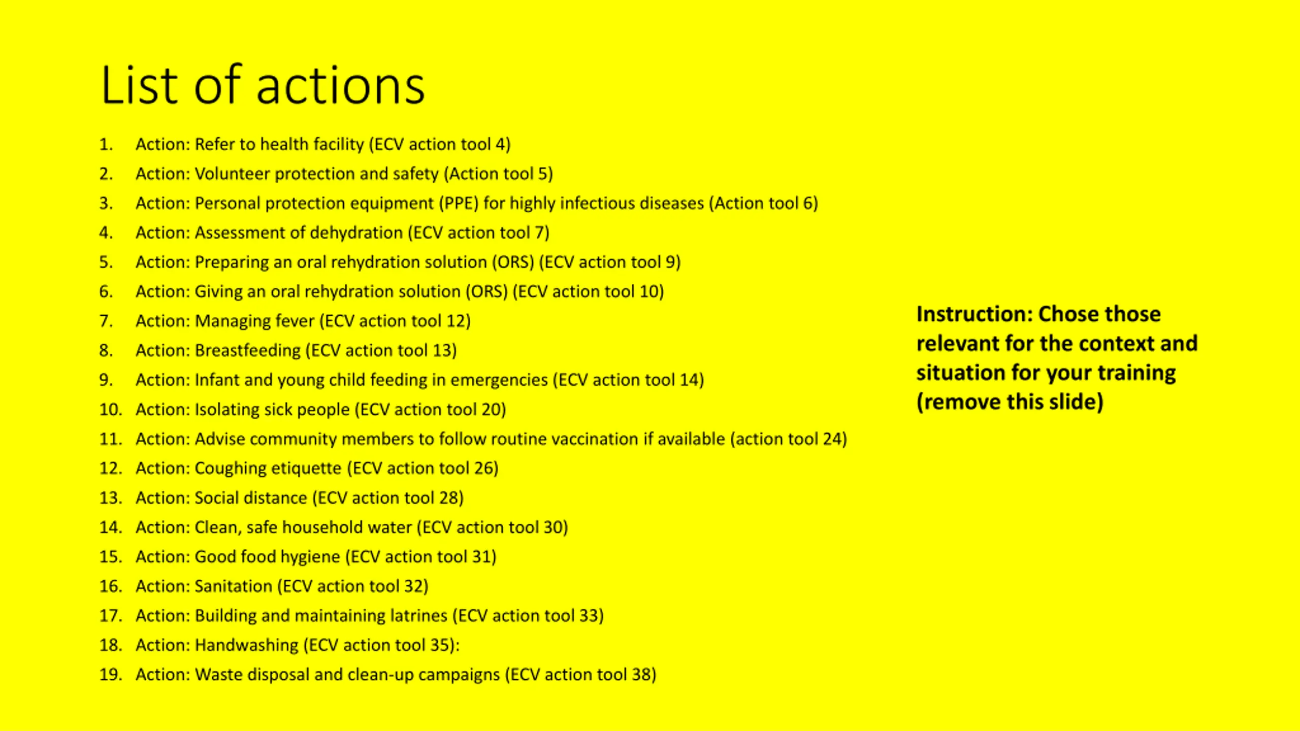 List of actions 1. Action: Refer to health facility (ECV action tool 4) 2. Action: Volunteer protection and safety (Action tool 5) 3. Action: Personal protection equipment (PPE) for highly infectious diseases (Action tool 6) 4. Action: Assessment of dehydration (ECV action tool 7) 5. Action: Preparing an oral rehydration solution (ORS) (ECV action tool 9) 6. Action: Giving an oral rehydration solution (ORS) (ECV action tool 10) Instruction: Chose those relevant for the context and situation for your training (remove this slide) 7. Action: Managing fever (ECV action tool 12) 8. Action: Breastfeeding (ECV action tool 13) 9. Action: Infant and young child feeding in emergencies (ECV action tool 14) 10. Action: Isolating sick people (ECV action tool 20) 11. Action: Advise community members to follow routine vaccination if available (action tool 24) 12. Action: Coughing etiquette (ECV action tool 26) 13. Action: Social distance (ECV action tool 28) 14. Action: Clean, safe household water (ECV action tool 30) 15. Action: Good food hygiene (ECV action tool 31) 16. Action: Sanitation (ECV action tool 32) 17. Action: Building and maintaining latrines (ECV action tool 33) 18. Action: Handwashing (ECV action tool 35): 19. Action: Waste disposal and clean-up campaigns (ECV action tool 38)