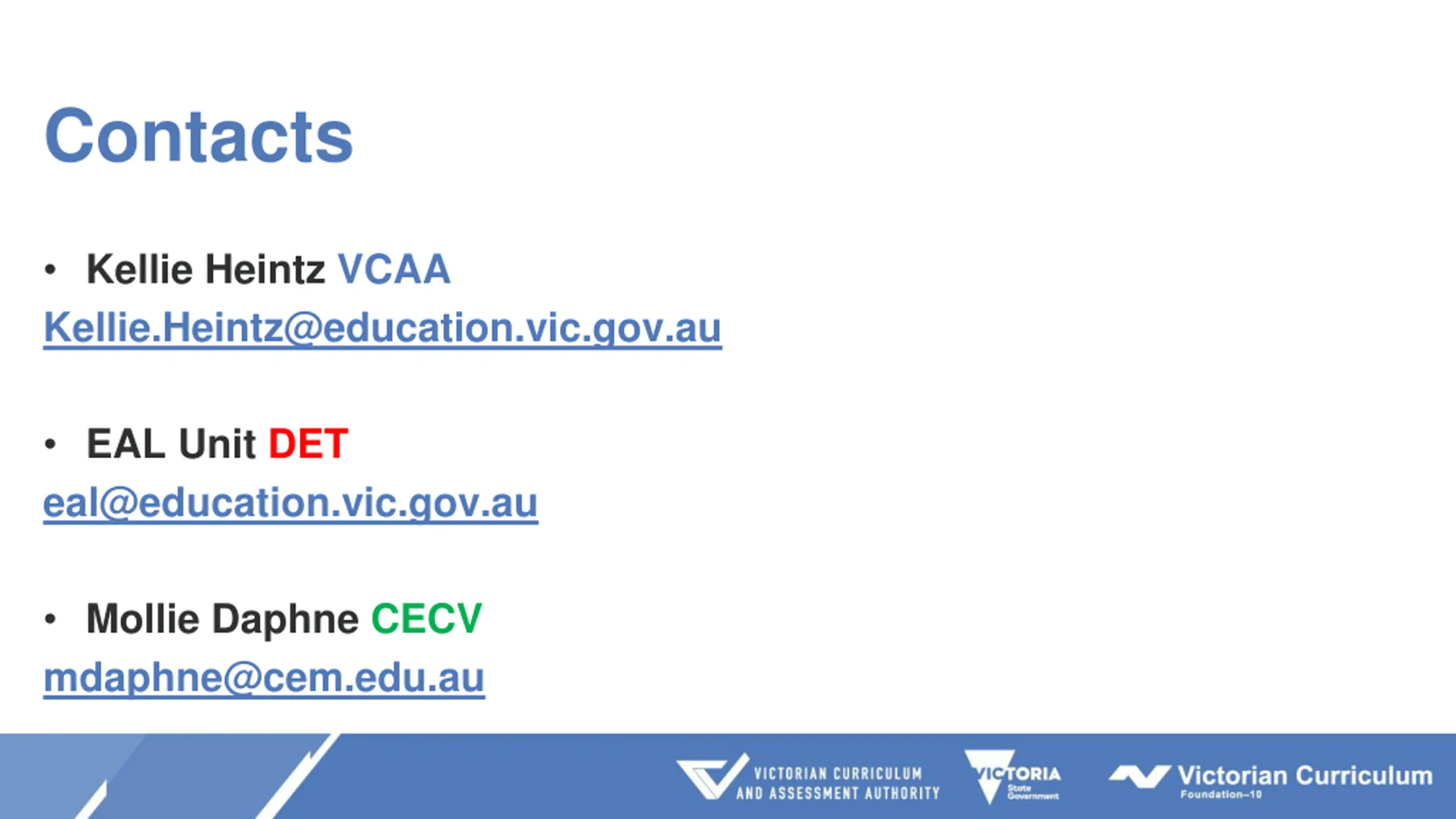 Contacts Kellie Heintz VCAA Kellie.Heintz@education.vic.gov.au EAL Unit DET eal@education.vic.gov.au Mollie Daphne CECV mdaphne@cem.edu.au