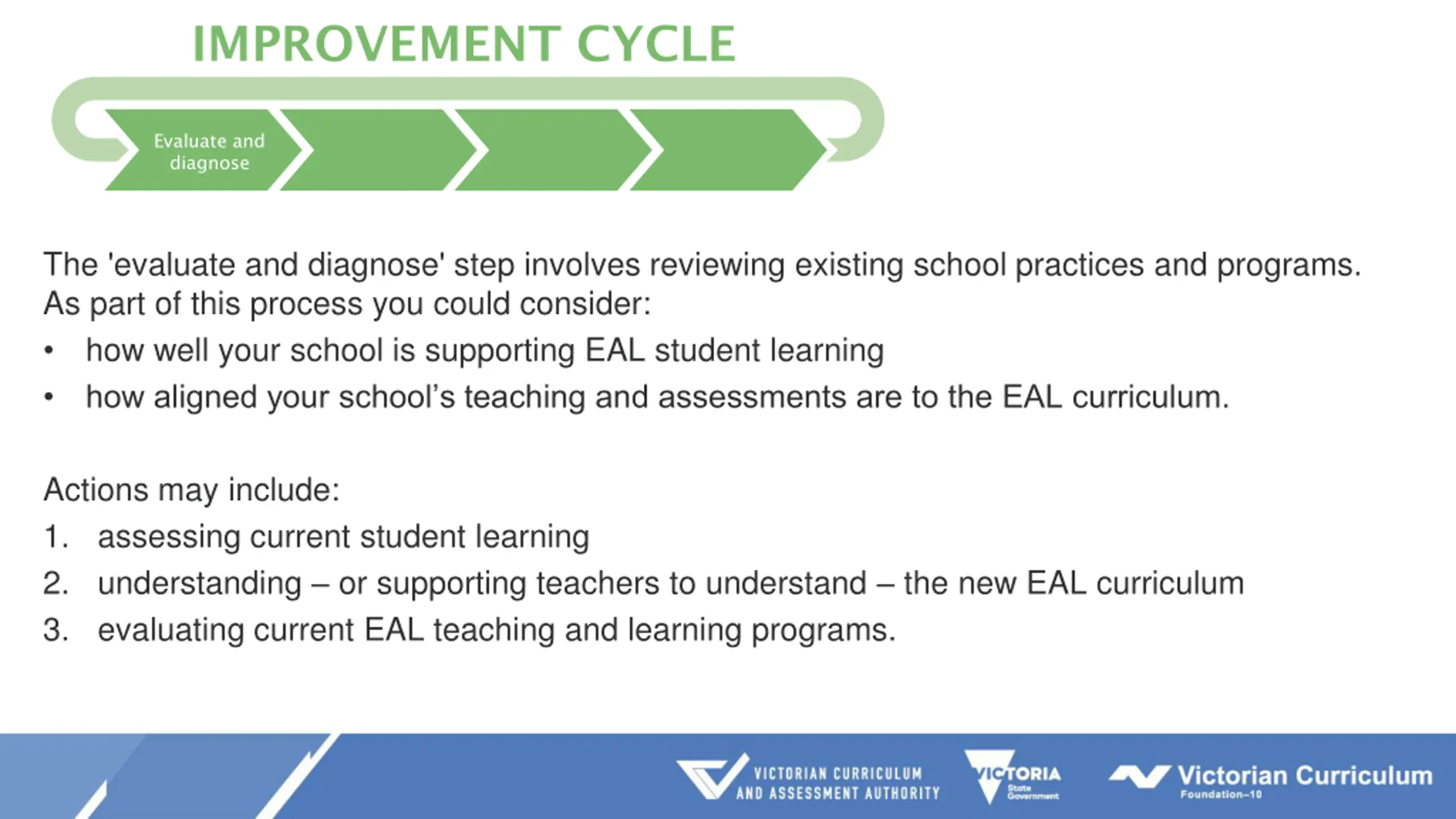 IMPROVEMENT CYCLE Evaluate and diagnose Prioritise and set goals Develop and plan Implement and monitor The 'evaluate and diagnose' step involves reviewing existing school practices and programs. As part of this process you could consider: how well your school is supporting EAL student learning how aligned your school s teaching and assessments are to the EAL curriculum. Actions may include: 1. assessing current student learning 2. understanding or supporting teachers to understand the new EAL curriculum 3. evaluating current EAL teaching and learning programs.