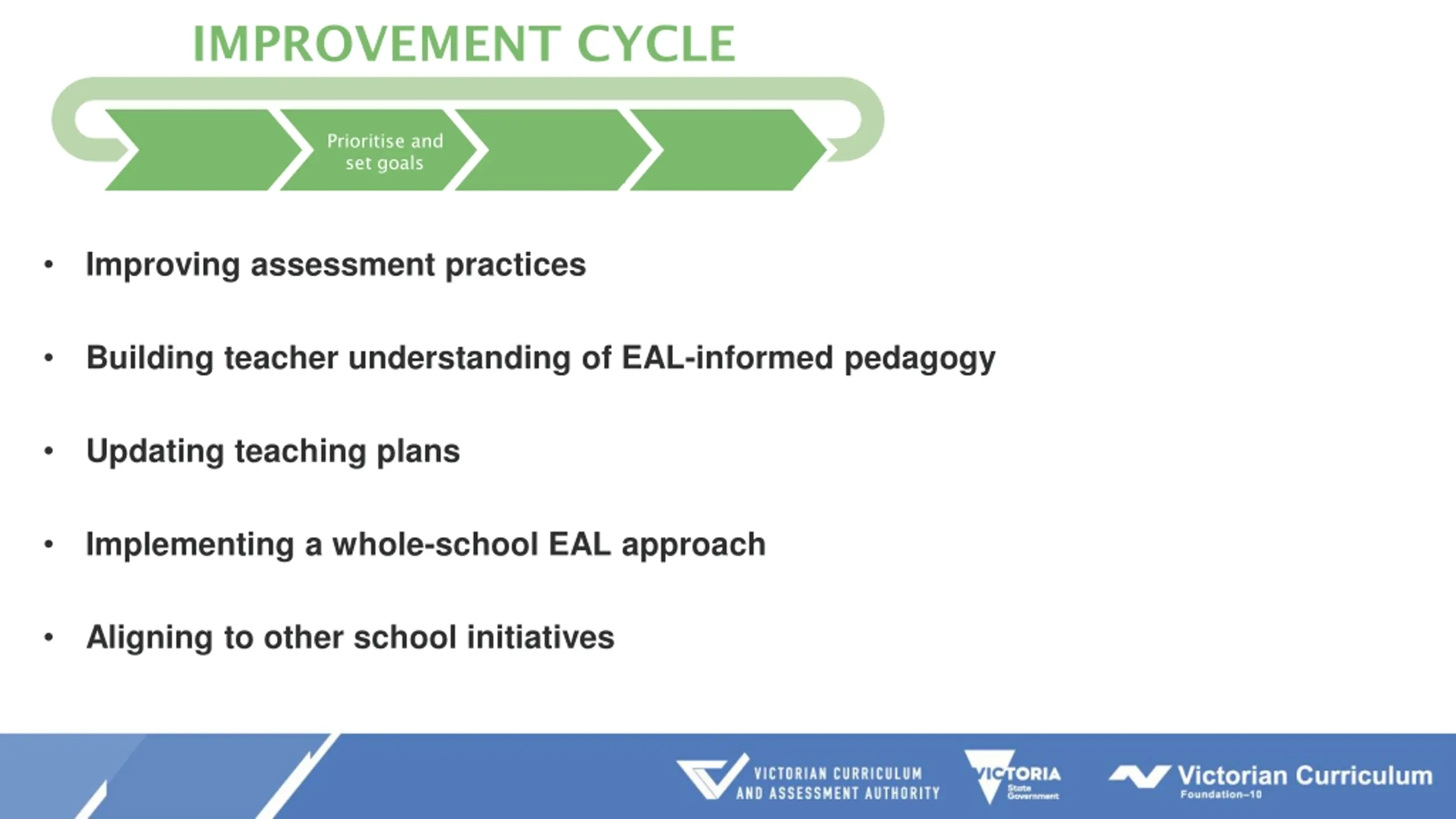IMPROVEMENT CYCLE Evaluate and diagnose Prioritise and set goals Develop and plan Implement and monitor Improving assessment practices Building teacher understanding of EAL-informed pedagogy Updating teaching plans Implementing a whole-school EAL approach Aligning to other school initiatives