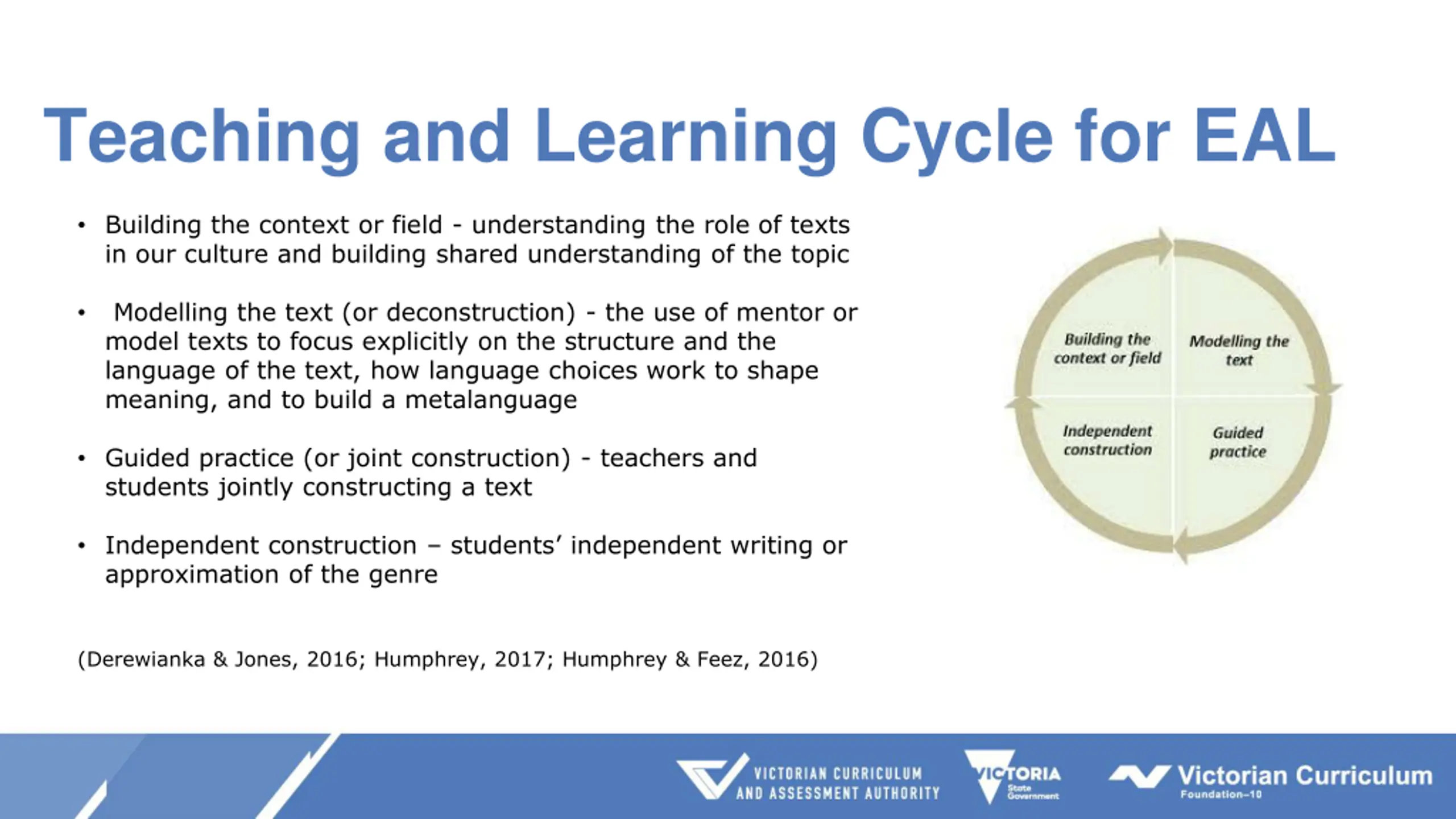 Teaching and Learning Cycle for EAL Building the context or field - understanding the role of texts in our culture and building shared understanding of the topic Modelling the text (or deconstruction) - the use of mentor or model texts to focus explicitly on the structure and the language of the text, how language choices work to shape meaning, and to build a metalanguage Guided practice (or joint construction) - teachers and students jointly constructing a text Independent construction students independent writing or approximation of the genre (Derewianka & Jones, 2016; Humphrey, 2017; Humphrey & Feez, 2016)