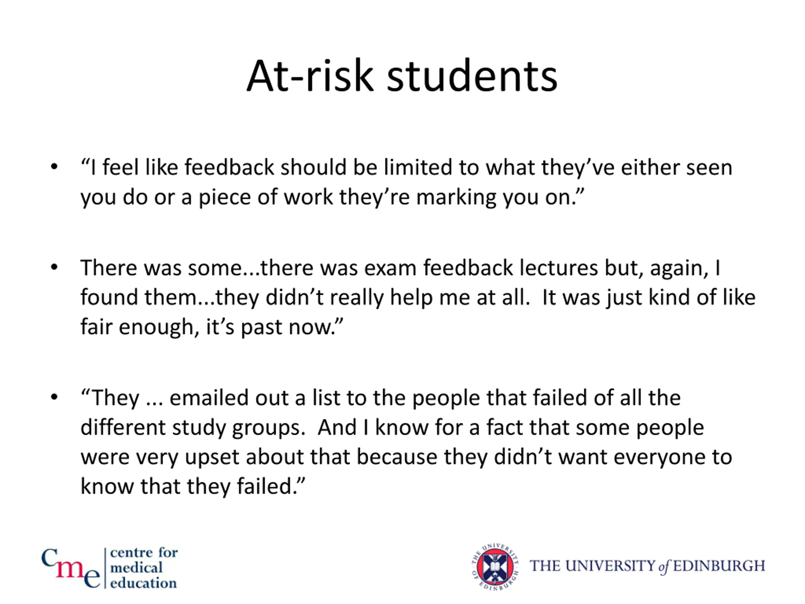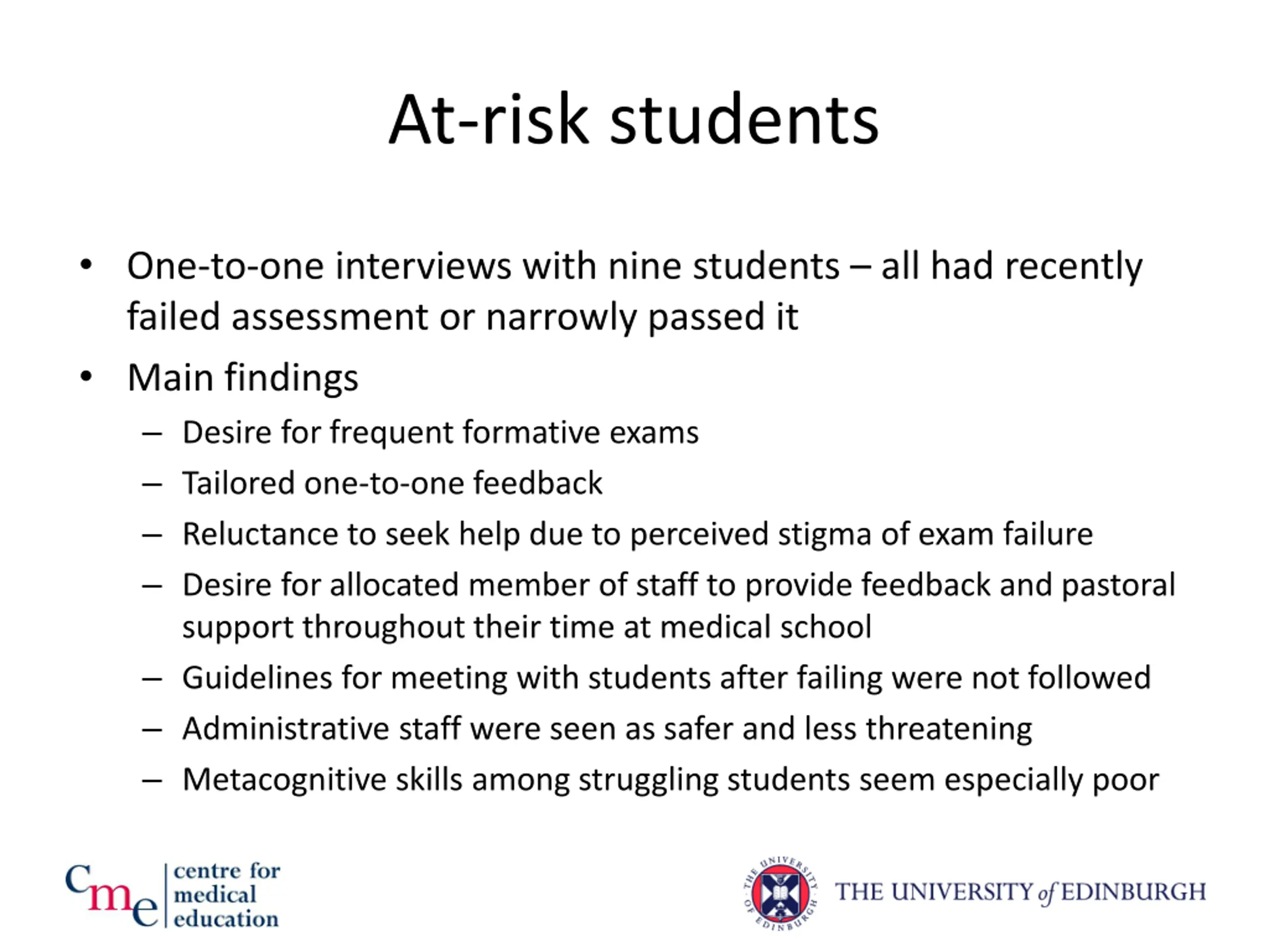 At-risk students One-to-one interviews with nine students all had recently failed assessment or narrowly passed it Main findings Desire for frequent formative exams Tailored one-to-one feedback Reluctance to seek help due to perceived stigma of exam failure Desire for allocated member of staff to provide feedback and pastoral support throughout their time at medical school Guidelines for meeting with students after failing were not followed Administrative staff were seen as safer and less threatening Metacognitive skills among struggling students seem especially poor