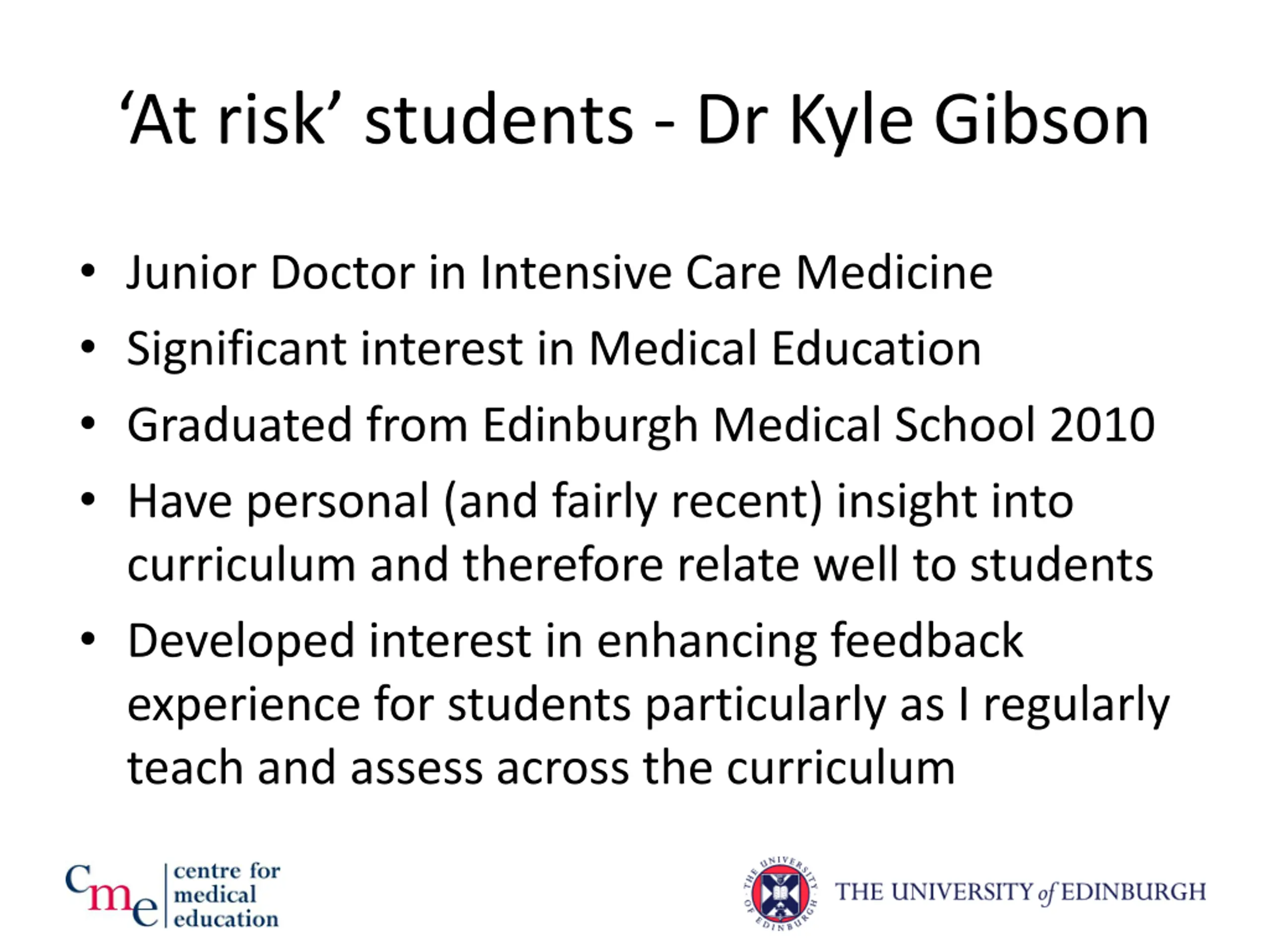 At risk students - Dr Kyle Gibson Junior Doctor in Intensive Care Medicine Significant interest in Medical Education Graduated from Edinburgh Medical School 2010 Have personal (and fairly recent) insight into curriculum and therefore relate well to students Developed interest in enhancing feedback experience for students particularly as I regularly teach and assess across the curriculum