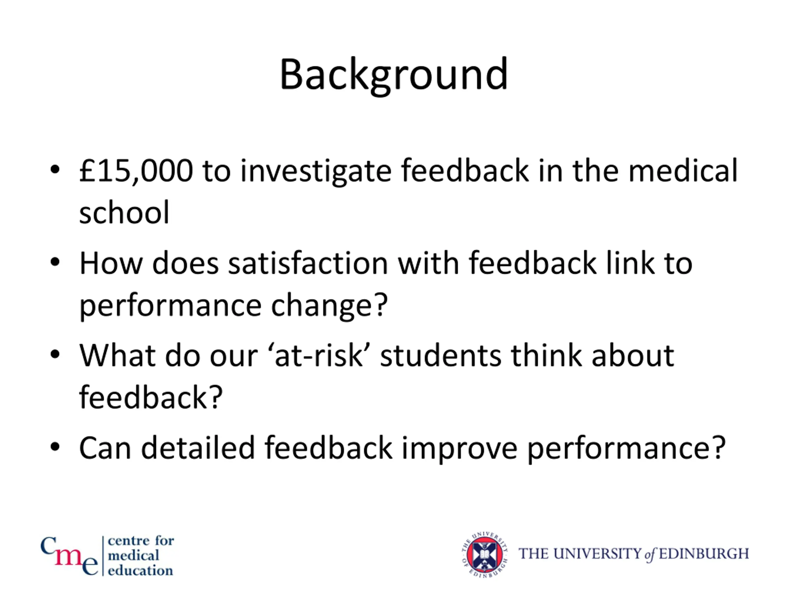 Background 15,000 to investigate feedback in the medical school How does satisfaction with feedback link to performance change? What do our at-risk students think about feedback? Can detailed feedback improve performance?