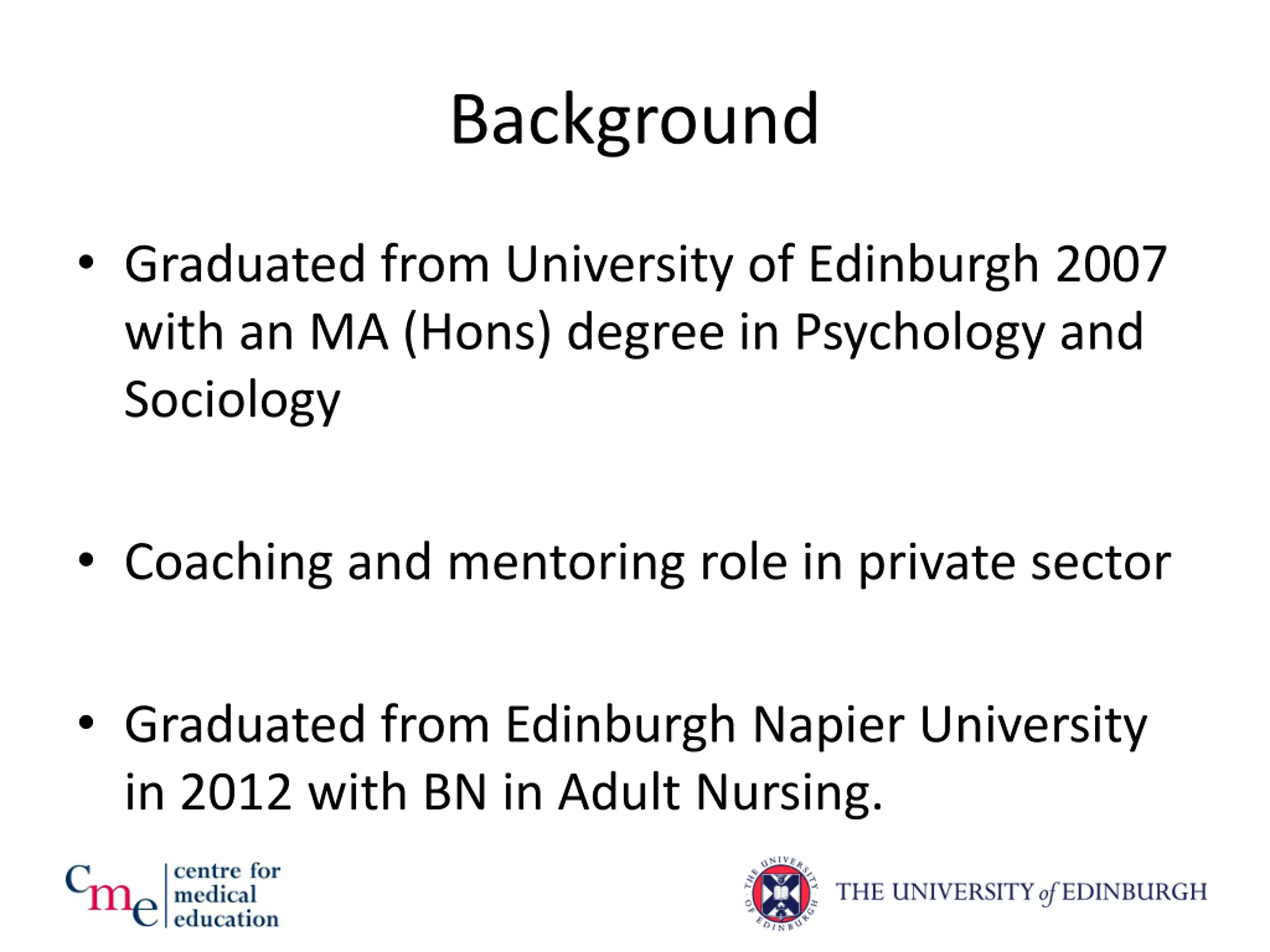 Background Graduated from University of Edinburgh 2007 with an MA (Hons) degree in Psychology and Sociology Coaching and mentoring role in private sector Graduated from Edinburgh Napier University in 2012 with BN in Adult Nursing.