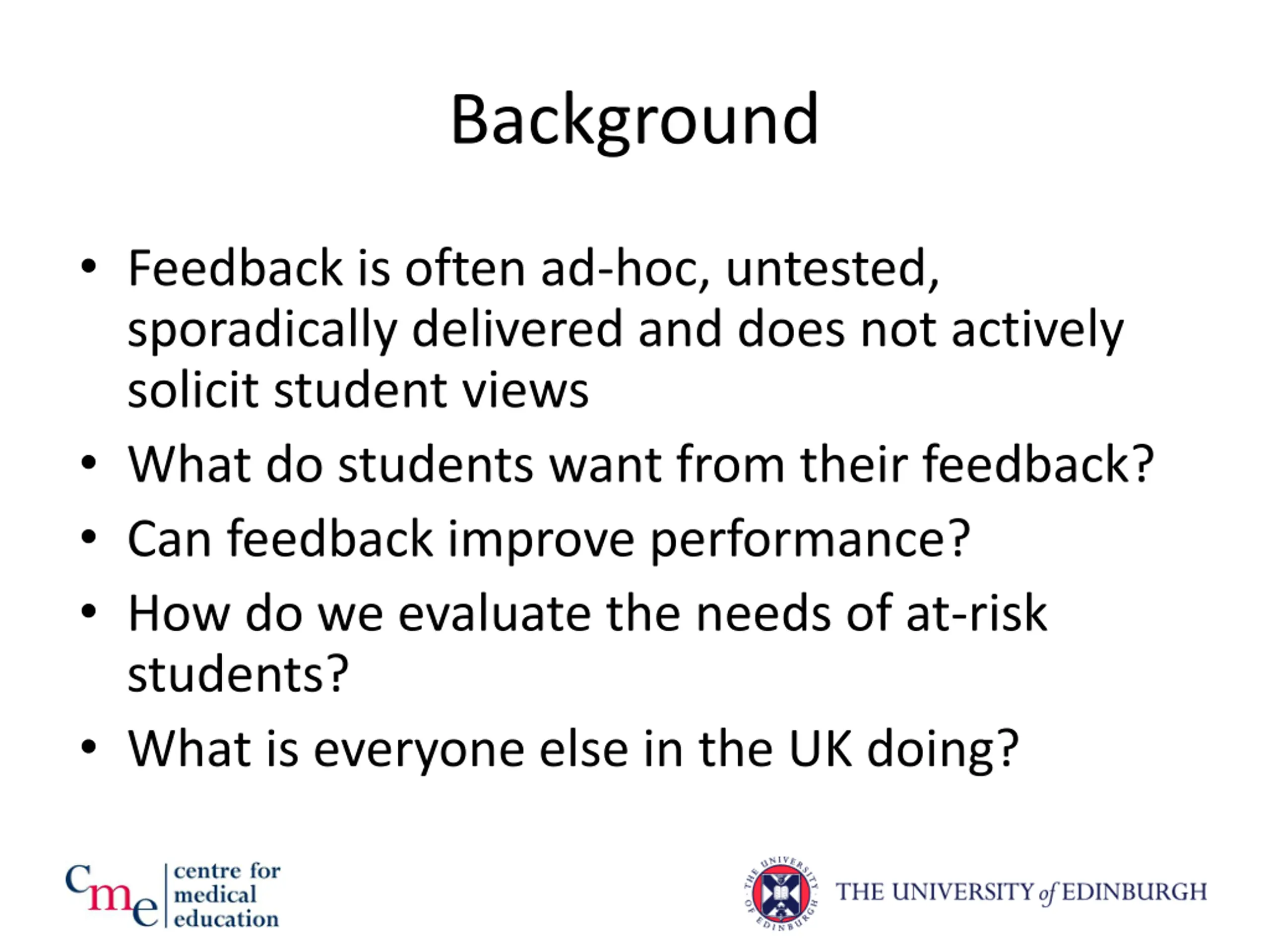 Background Feedback is often ad-hoc, untested, sporadically delivered and does not actively solicit student views What do students want from their feedback? Can feedback improve performance? How do we evaluate the needs of at-risk students? What is everyone else in the UK doing?