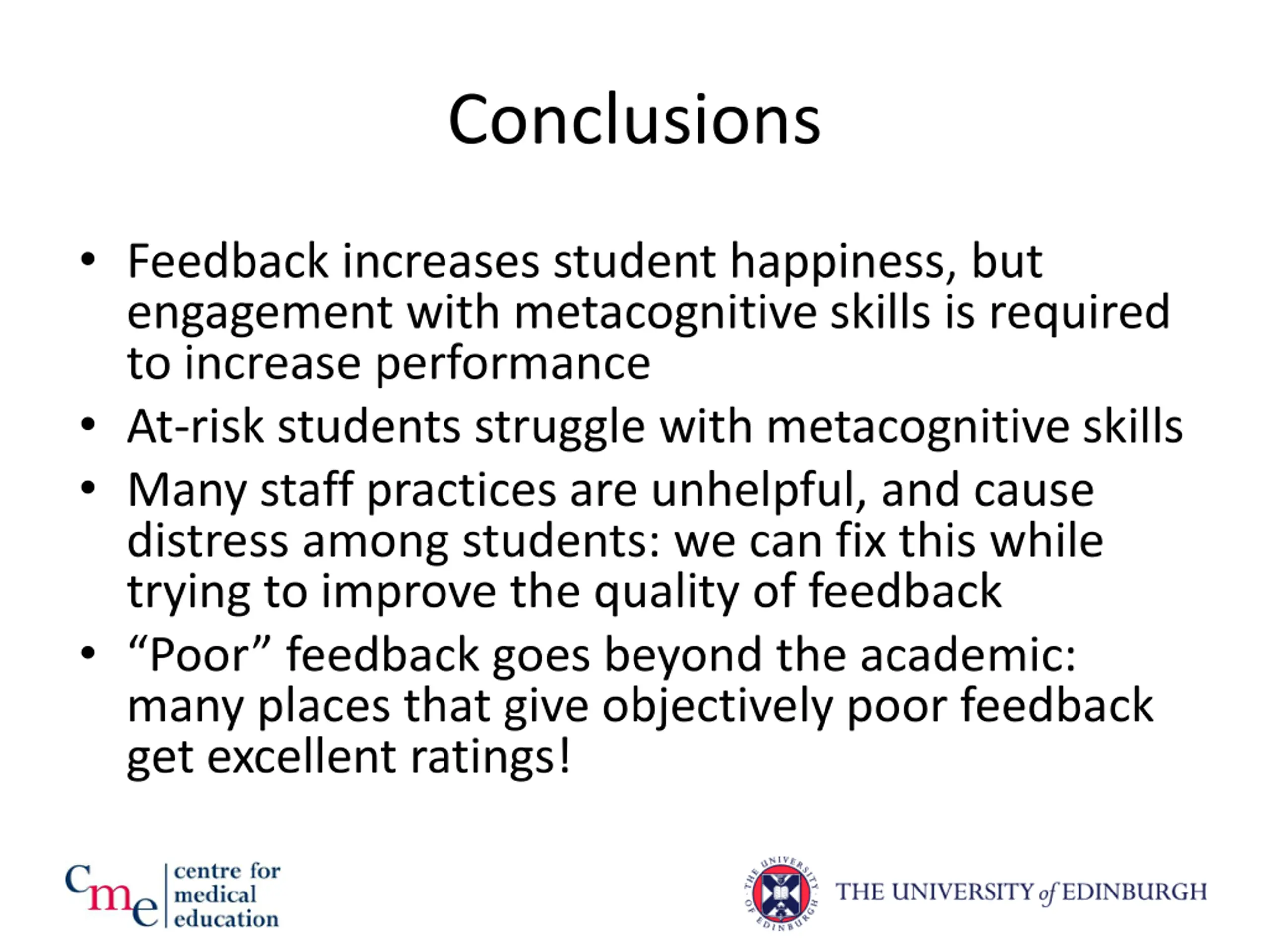 Conclusions Feedback increases student happiness, but engagement with metacognitive skills is required to increase performance At-risk students struggle with metacognitive skills Many staff practices are unhelpful, and cause distress among students: we can fix this while trying to improve the quality of feedback Poor feedback goes beyond the academic: many places that give objectively poor feedback get excellent ratings!