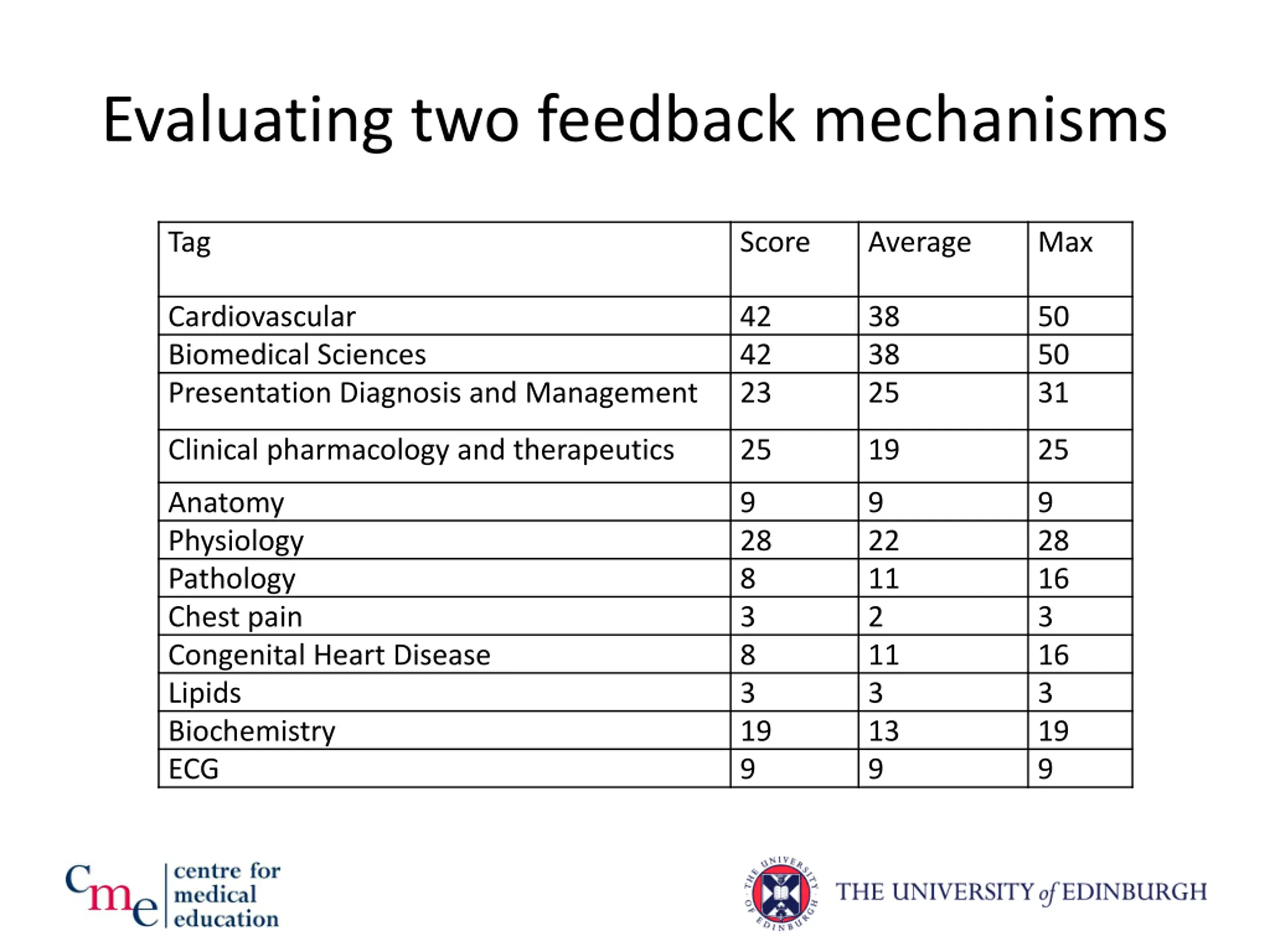 Evaluating two feedback mechanisms Tag Score Average Max Cardiovascular Biomedical Sciences Presentation Diagnosis and Management 42 42 23 38 38 25 50 50 31 Clinical pharmacology and therapeutics 25 19 25 Anatomy Physiology Pathology Chest pain Congenital Heart Disease Lipids Biochemistry ECG 9 28 8 3 8 3 19 9 9 22 11 2 11 3 13 9 9 28 16 3 16 3 19 9