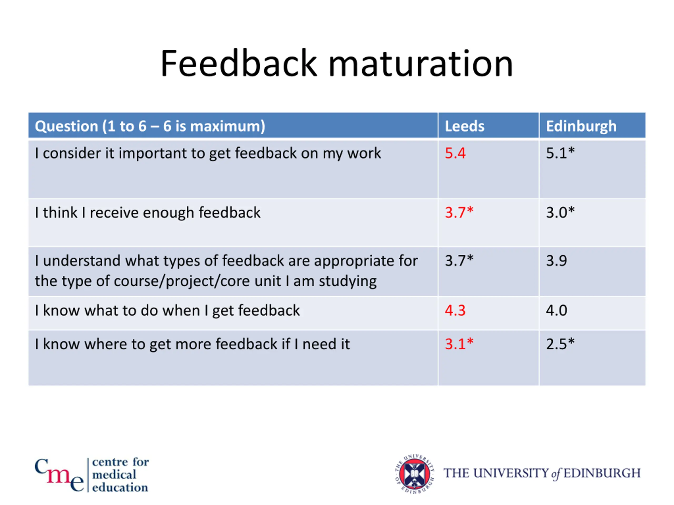 Feedback maturation Question (1 to 6 6 is maximum) Leeds Edinburgh I consider it important to get feedback on my work 5.4 5.1* I think I receive enough feedback 3.7* 3.0* I understand what types of feedback are appropriate for the type of course/project/core unit I am studying 3.7* 3.9 I know what to do when I get feedback 4.3 4.0 I know where to get more feedback if I need it 3.1* 2.5*