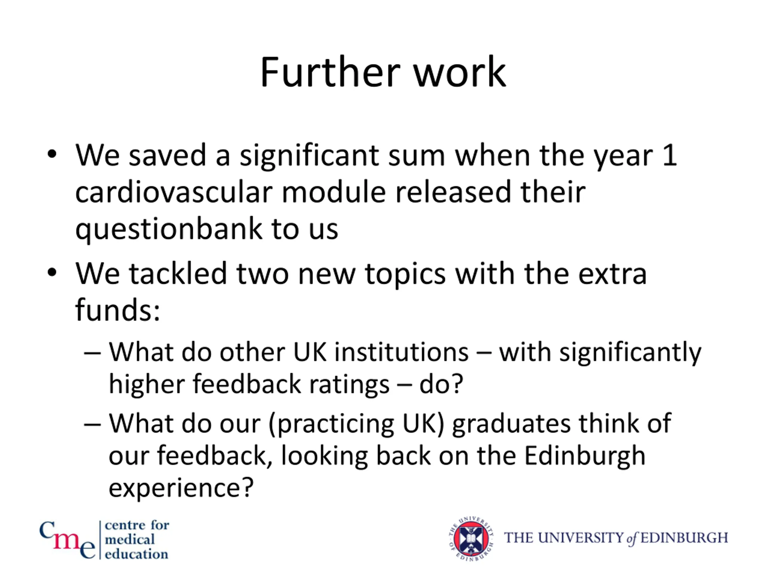 Further work We saved a significant sum when the year 1 cardiovascular module released their questionbank to us We tackled two new topics with the extra funds: What do other UK institutions with significantly higher feedback ratings do? What do our (practicing UK) graduates think of our feedback, looking back on the Edinburgh experience?