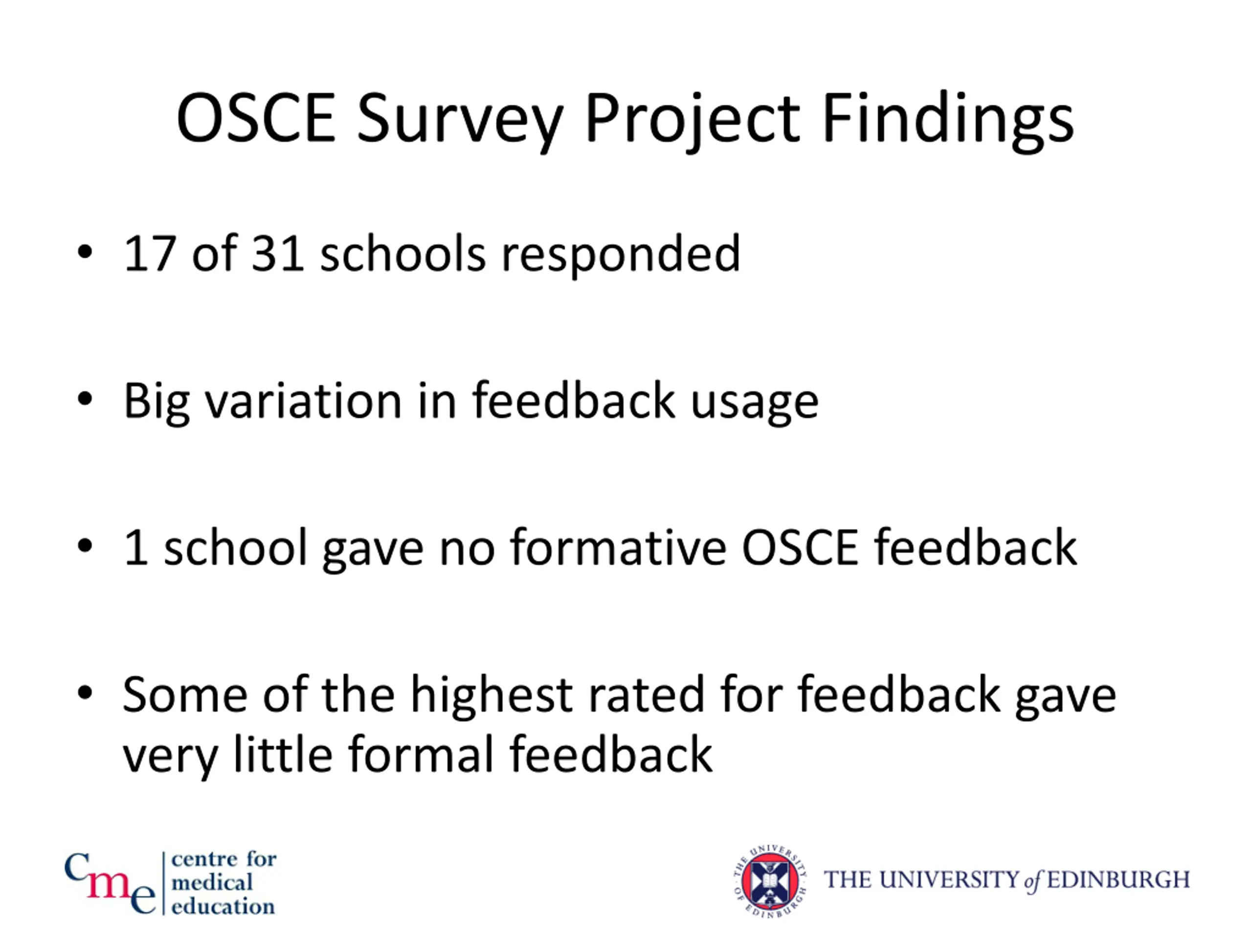 OSCE Survey Project Findings 17 of 31 schools responded Big variation in feedback usage 1 school gave no formative OSCE feedback Some of the highest rated for feedback gave very little formal feedback